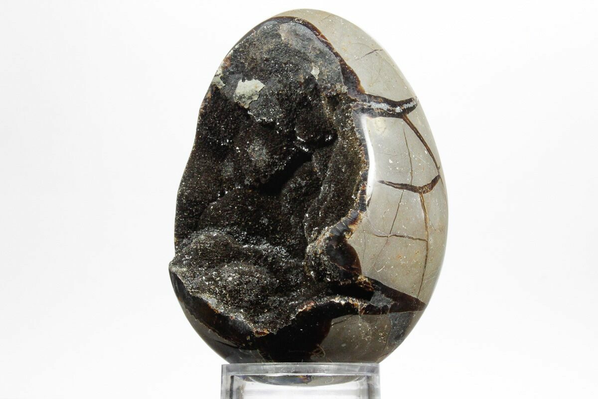 This is a gorgeous septarian "dragon egg" geode collected in the Betsiboka Region of Madagascar. The hollow cavity is full of beautiful, sparkling black & brown calcite crystals. It is a hollow septarian nodule which has been polished into an egg shape, and the natural cracked pattern of the septarian gives it the appearance of a dragons egg. A spectacular display piece which would look great in your home/office or make a great gift for the Game of Thrones enthusiast you know.