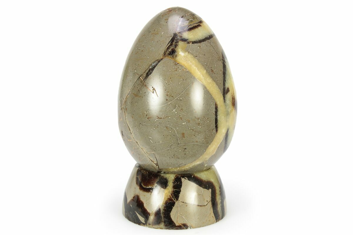 This is a beautiful, hand-polished egg and stand that were both sculpted from septarian. The septarian comes from the Betsiboka Region of Madagascar and was deposited during the Jurassic period. The polishing reveals a beautiful pattern of yellow calcite, brown aragonite, and grey-brown limestone. The polished septarian base has a concave depression that the egg sits upright within, creating this aesthetic display.