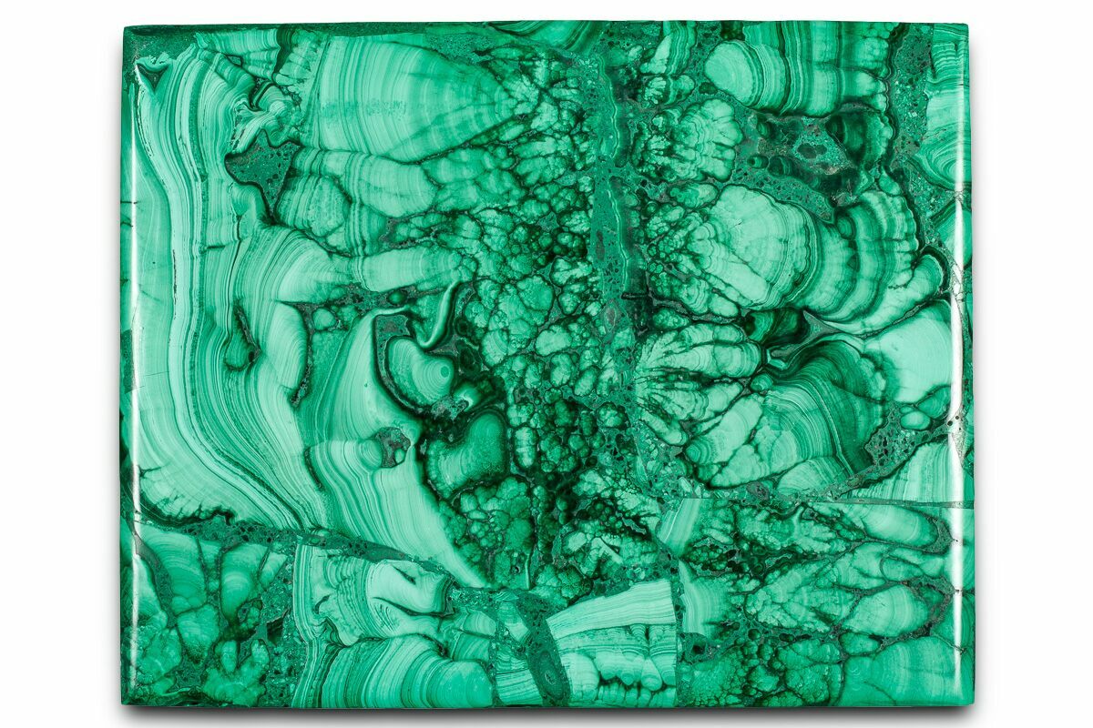 Malachite is an intense green copper-based mineral that can be found in a wide variety of forms. Malachite can grow in botryoidal masses, stalactitic formations, and reniform formations, typically as a tight cluster of fanning fibrous needles that make up a seemingly solid mass. As layers continue to stack during formation, banded patterns can sometimes begin to take shape, explaining the rings in all shades of green seen on most polished malachite specimens.
