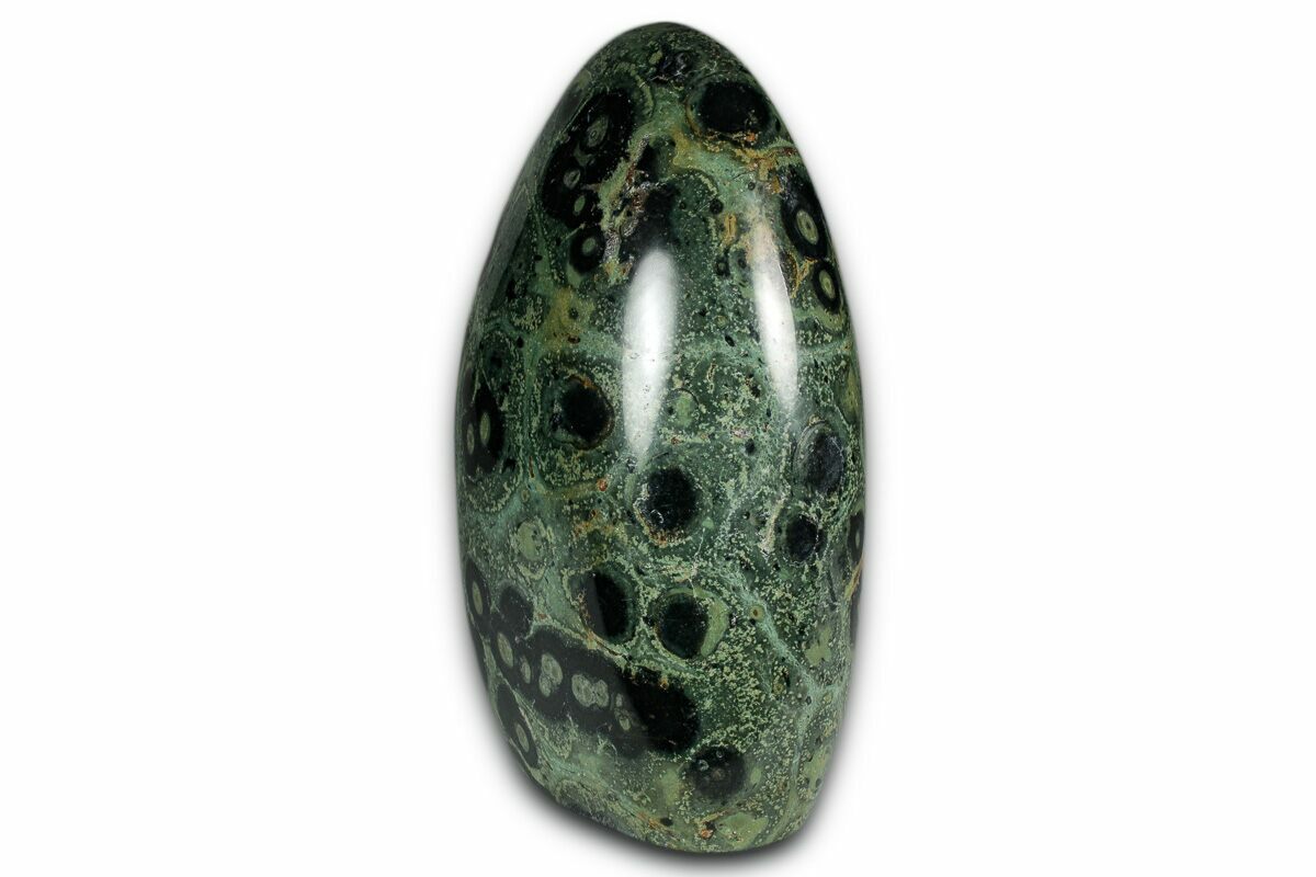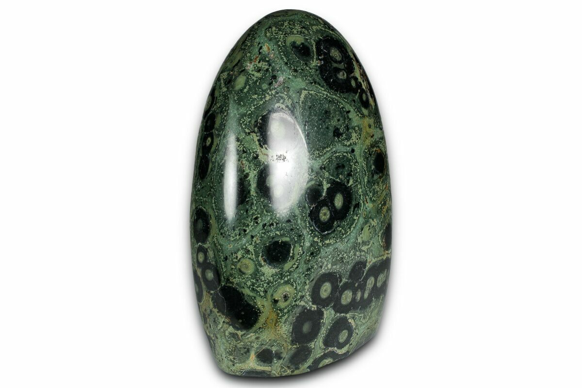 This is a 4.3" tall, polished piece of Kambaba Jasper from Madagascar, shaped so the base sits flat for effortless display on any surface. The stone features the distinctive deep green and black orbicular patterns. A striking addition to any mineral collection or décor setting, it stands beautifully on its own as a natural work of art.