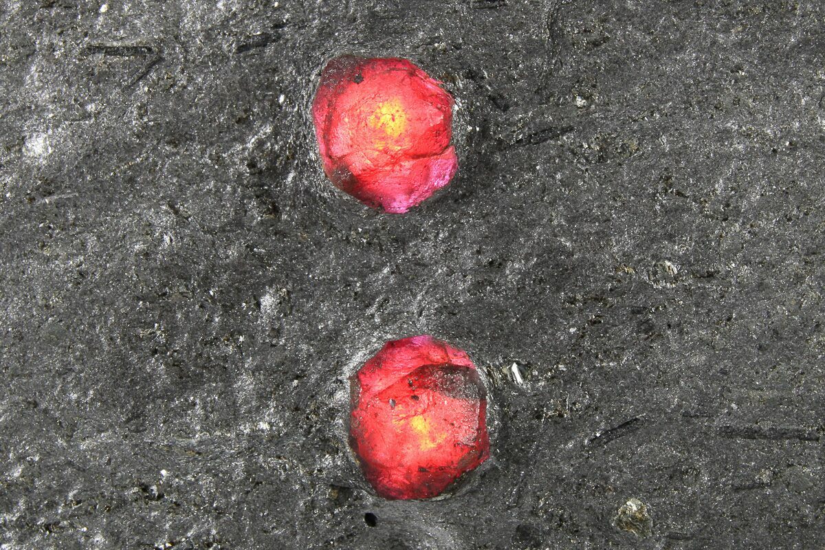 The Red Embers Garnet Mine (previously known as the Two Fat Guys Mine) is located in Erving, Massachusetts. This mine is known for producing vibrant red, translucent almandine garnets in a graphite matrix. Mining of these specimens began over 20 years ago and to this day is still ongoing. The vein from which these specimens are extracted is composed primarily of graphite that ranges in size from 1 to 6 feet wide in some spots. The garnets are scattered throughout this graphite matrix along with black dravite tourmaline crystals.