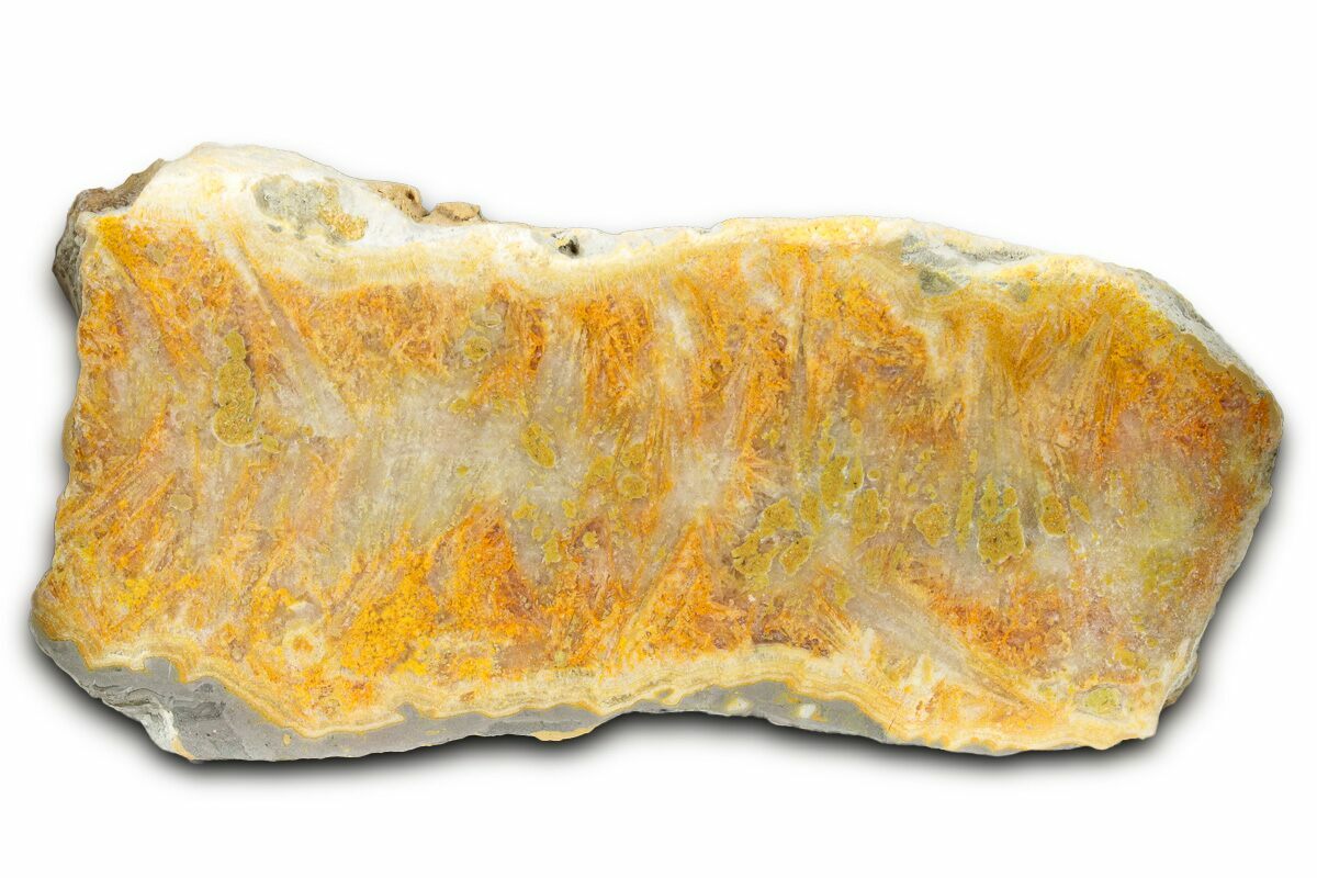 Bumblebee jasper is the trade name for a vibrantly colored, fibrous calcite mined exclusively from Mount Papandayan in Indonesia. It is has very distinctive yellow, orange, and black banding resembling the color patterns of a bumblebee, hence the name. The orange and yellow colors are mainly caused by finely dispersed realgar while the black bands are caused by pyrite. Technically it is not a jasper, as it is primarily calcite and contains very little silica.