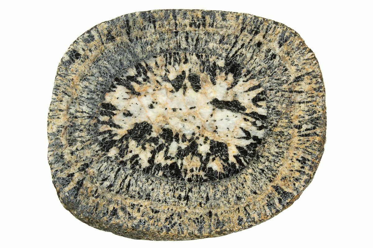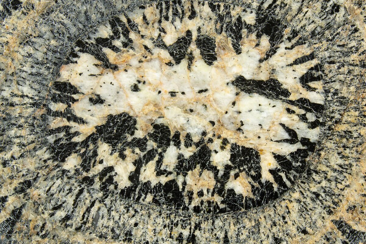 Orbicular granite occurs only rarely, and their occurrences are often very small. Most deposits are found in Finland, but notable deposits can also be found in Chile and Australia. This material is from the Australian Boogardie Orbicular Granite deposit, near Mount Magnet in Western Australia. It is characterized by light andesine with darker hornblende and biotite radiating from plagioclase or hornblende cores. This orbicular granite is touted as the oldest in the world, at almost 2.7 billion years!