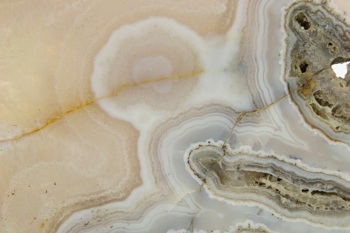 This is a beautiful slab of Sowbelly Agate collected from the Last Chance Mine in Creede, Colorado. It features gorgeous bands of agate and quartz. There are dendritic formations of native silver scattered throughout the slab as well.