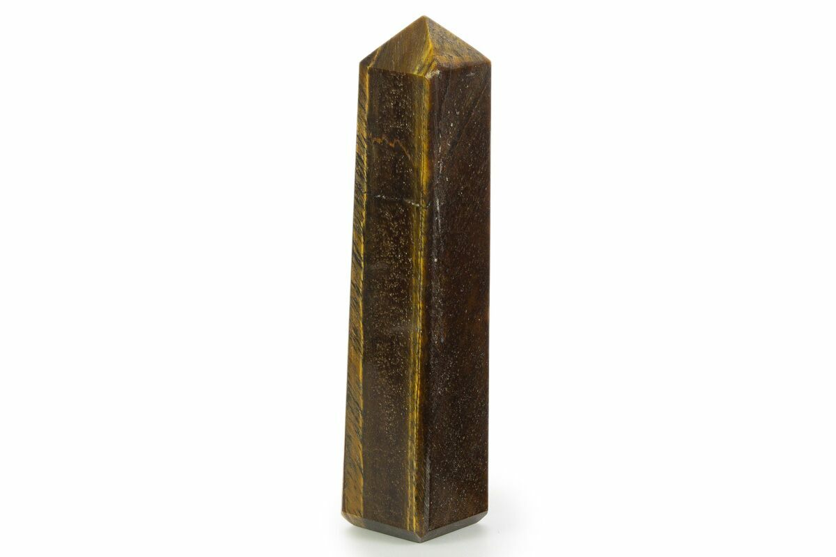 This is a 4.3" tall, polished tower of tiger’s eye, showcasing the stone’s signature golden-brown chatoyance. Its shimmering bands shift beautifully in the light, creating a striking display of depth and movement. Expertly shaped into a sleek tower, it makes an eye-catching accent for any mineral collection, desk, or shelf.