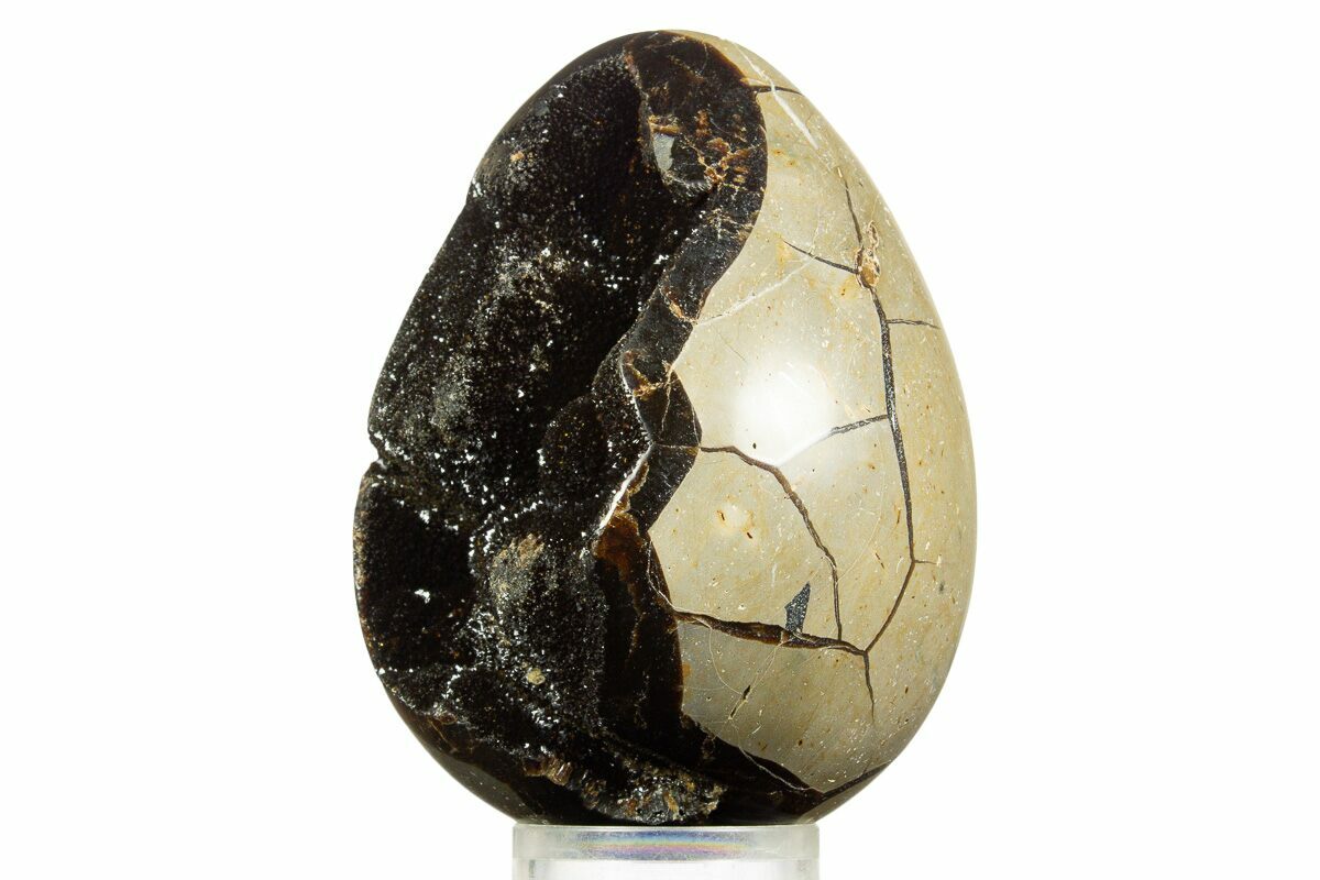 Septarian nodules formed tens of millions of years ago when shrinking mudballs fractured and were later filled with minerals like calcite, aragonite, and limestone. The result is the natural “dragon-scale” pattern that makes them so recognizable and so popular. Madagascar’s deposits are particularly prized for their bold contrast and vibrant golden interiors, and when polished into egg shapes they become some of the most dramatic and decorative septarian pieces available—equal parts geology, artistry, and myth.