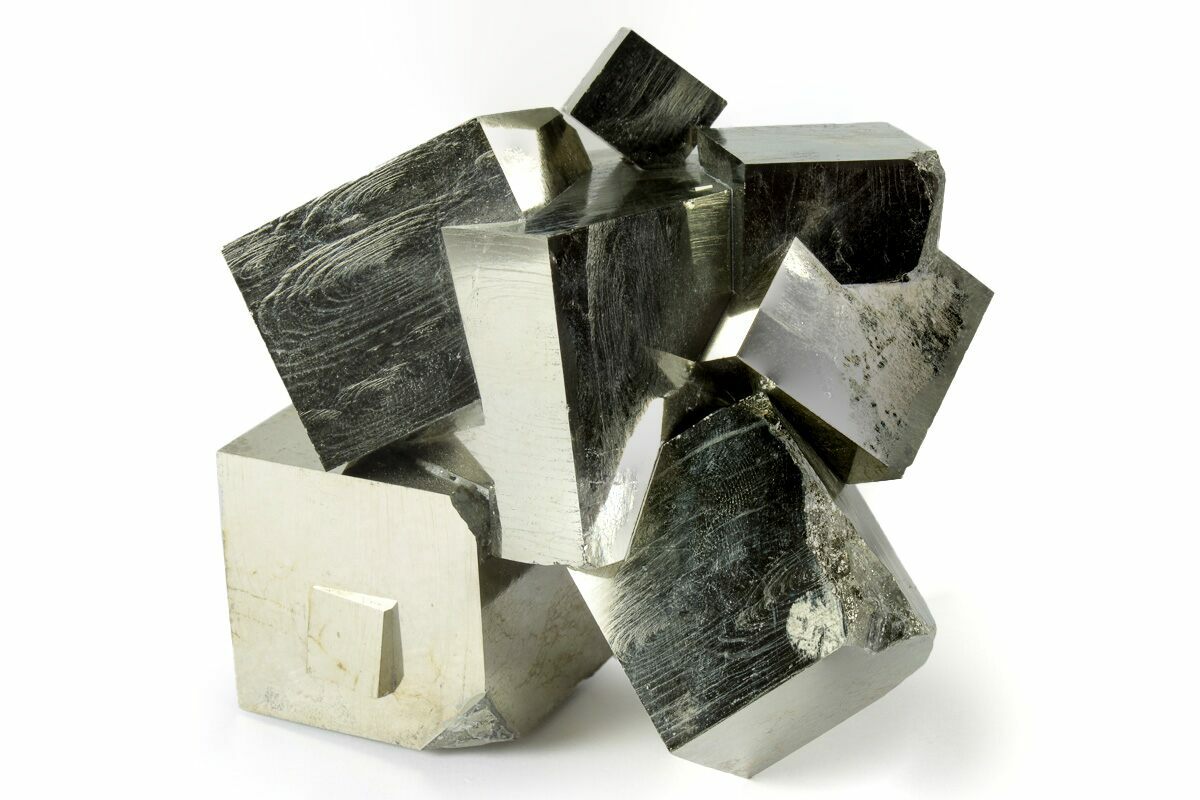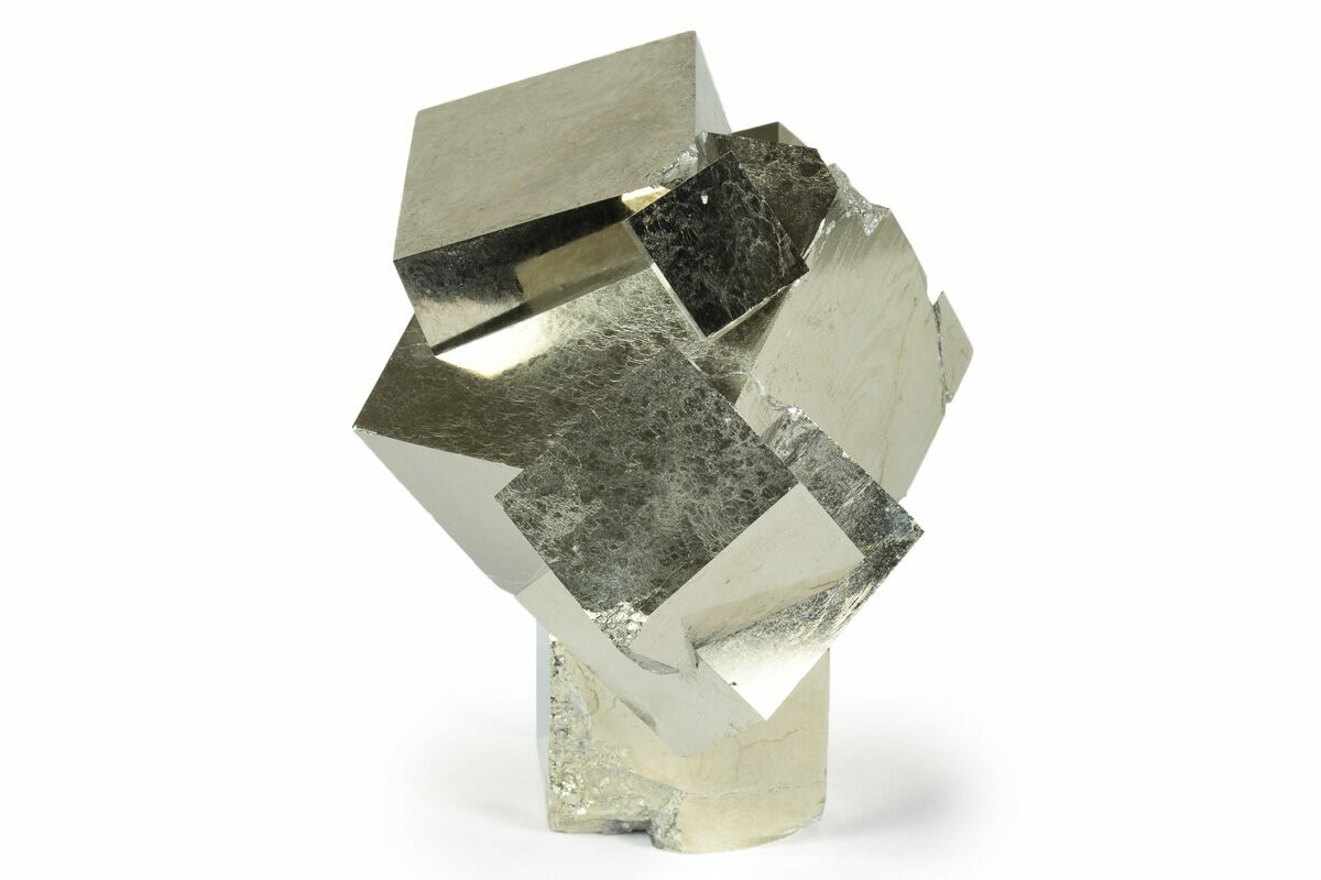 At first glance some people assume that these pyrite cubes are man-made, but the amazing thing is that they are natural! Pyrite from this location is famous for its beautiful shine, near-perfect cubic formation, and sculptural appearance. Because the matrix rock is soft, the cubes often come loose during collection. Care is taken during preparation to stabilize, repair, and make sure everything is remounted in its natural position: no specimens are composites. This means that nearly all of the pyrite cubes still in the rock from this locality have been remounted, and most clusters of multiple cubes have been stabilized.