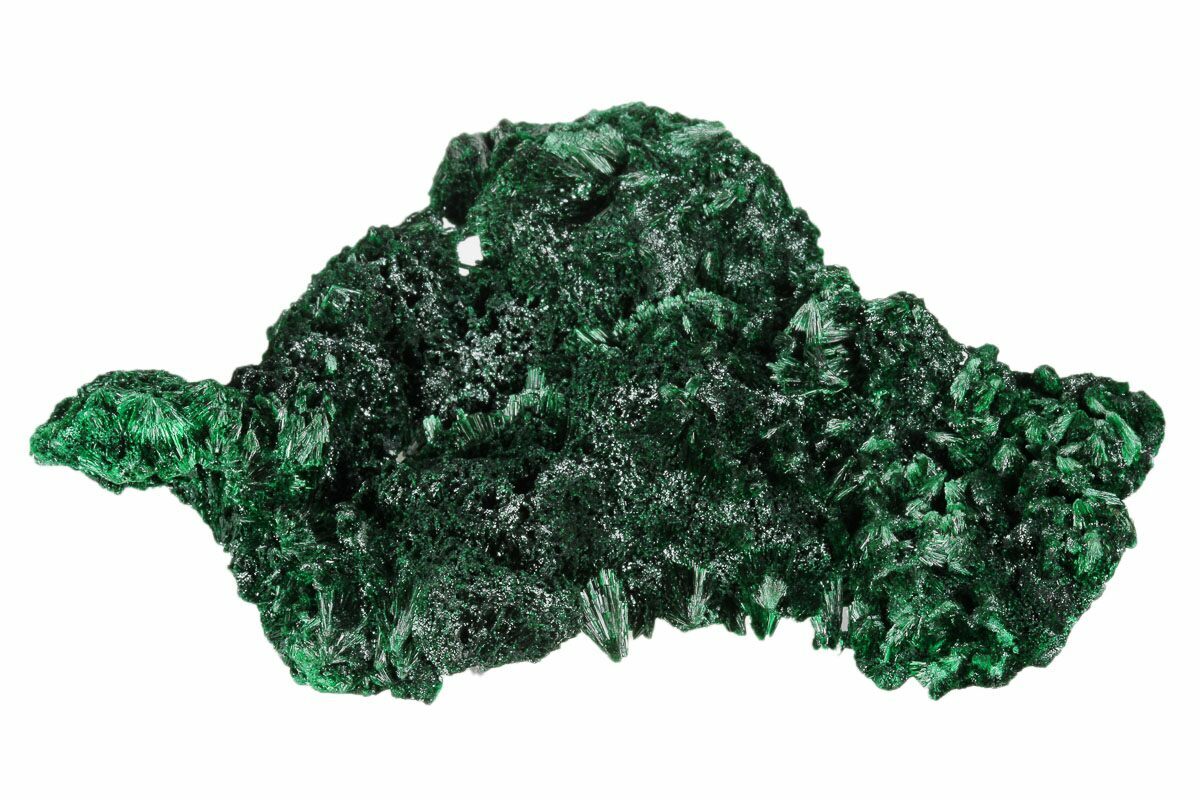 Malachite is an intense green copper-based mineral that can be found in a wide variety of forms. Malachite can grow in botryoidal masses, stalactitic formations, and reniform formations, typically as a tight cluster of fanning fibrous needles that make up a seemingly solid mass. As layers continue to stack during formation, banded patterns can sometimes begin to take shape, explaining the rings in all shades of green seen on most polished malachite specimens.