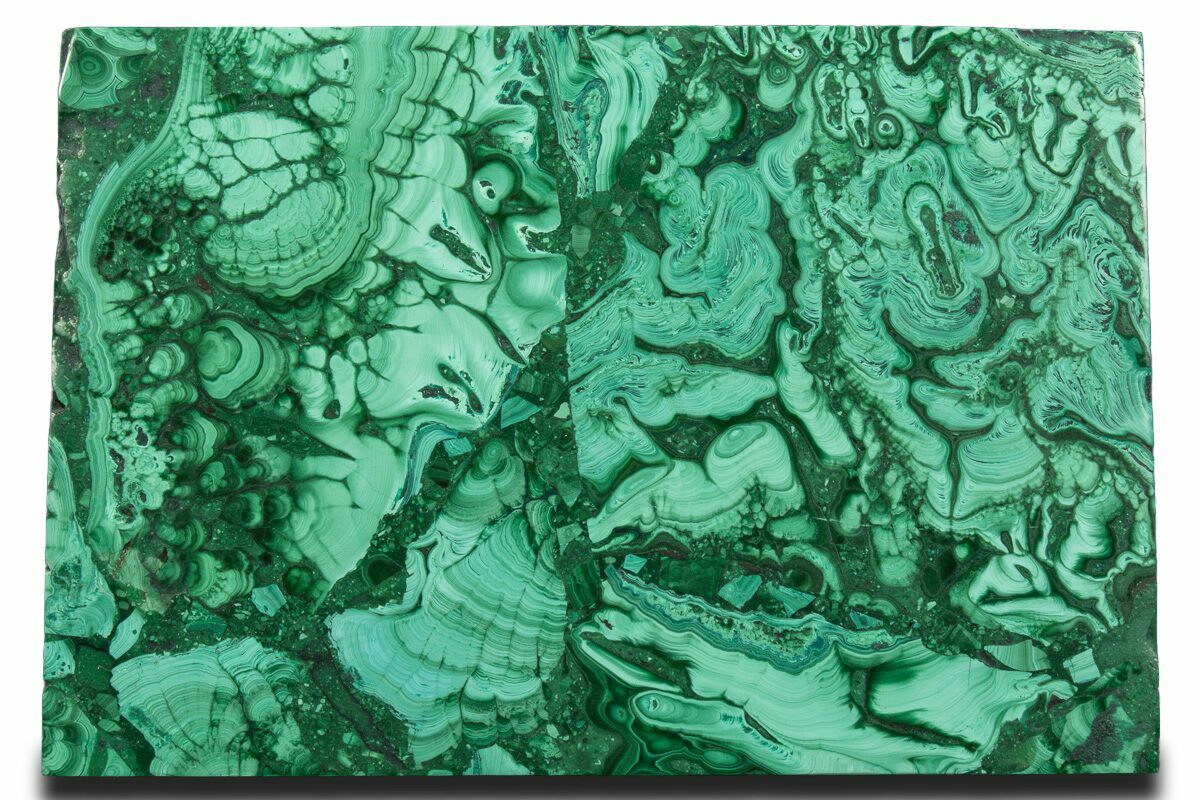 Malachite is an intense green copper-based mineral that can be found in a wide variety of forms. Malachite can grow in botryoidal masses, stalactitic formations, and reniform formations, typically as a tight cluster of fanning fibrous needles that make up a seemingly solid mass. As layers continue to stack during formation, banded patterns can sometimes begin to take shape, explaining the rings in all shades of green seen on most polished malachite specimens.