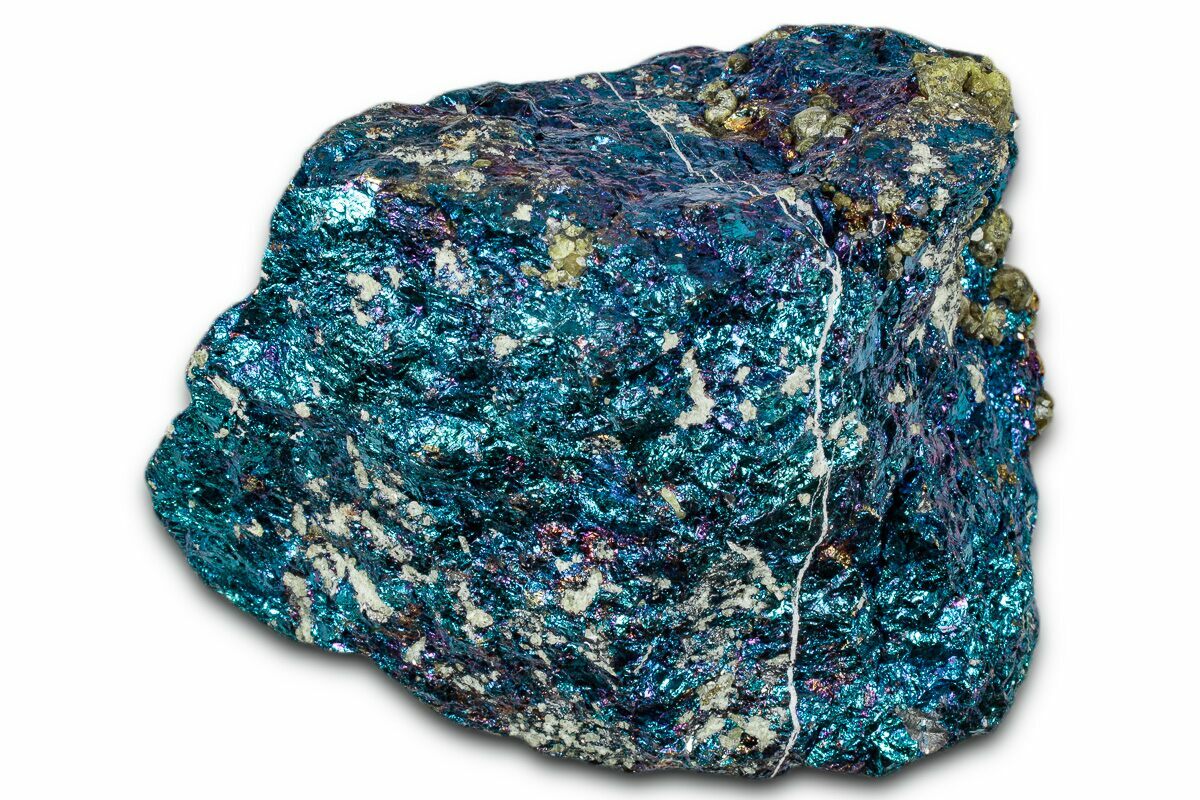 Often called “Peacock Ore” for its vivid, iridescent colors, this material is actually chalcopyrite that has been treated with acid. The treatment replicates a natural process that forms the much rarer copper mineral bornite.