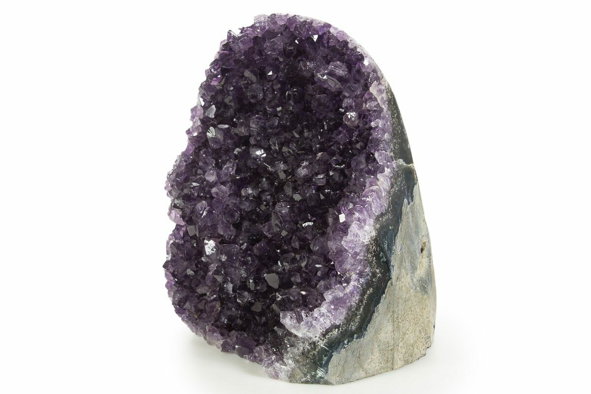 This is a 4.4" grape-jelly purple amethyst geode section from the famous amethyst mines in Artigas, Uruguay. The base has been cut flat so that it stands up nicely on a flat surface.