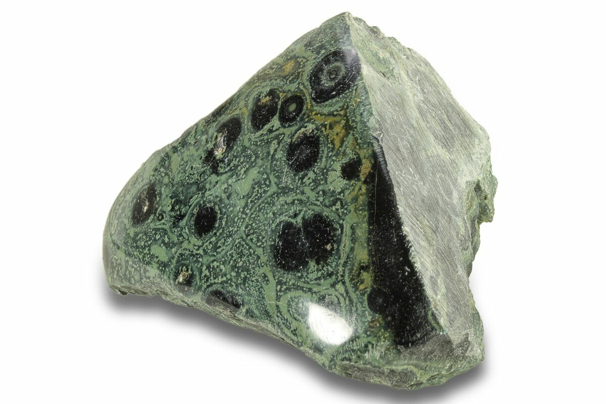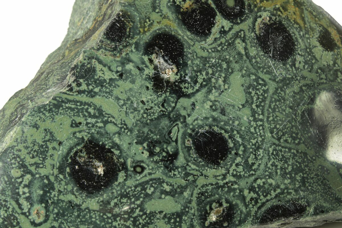 Kambaba jasper—also known in the trade as “crocodile jasper”—is a striking, green-and-black ornamental stone originating from the west-central Bongolava region of Madagascar. Despite the name, it isn’t a true jasper at all, but a rhyolitic volcanic rock that formed from ancient silica-rich lava flows. Its signature appearance comes from swirling green groundmass punctuated by dark, orbicular structures composed of fine amphibole needle aggregates. These orbs can resemble reptilian or amphibian eyes, which is how the nickname “crocodile jasper” arose.