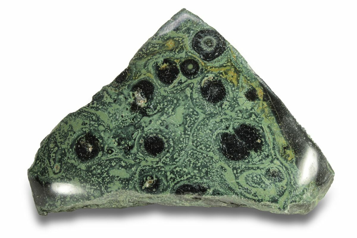 This is a beautiful Kambaba Jasper specimen with one polished face, collected from Madagascar. It is 4.4" wide and has dark circular mineral formations throughout the jasper. The base has been cut flat so that it displays nicely on a hard surface and would be suitable as either an indoor or outdoor decorative piece.