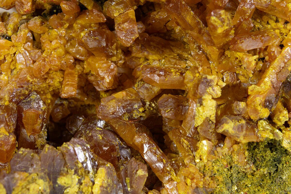 Orpiment is a bright orange to yellow arsenic sulfide mineral. Its name is derived from the latin phrase auripigmentum, meaning “gold pigment”. It is frequently found as a decay byproduct and in association with another arsenic mineral, realgar. Orpiment crystals are commonly found in dense groupings containing small, prismatic crystals, often with chisel-shaped or triangular pyramidal terminations.