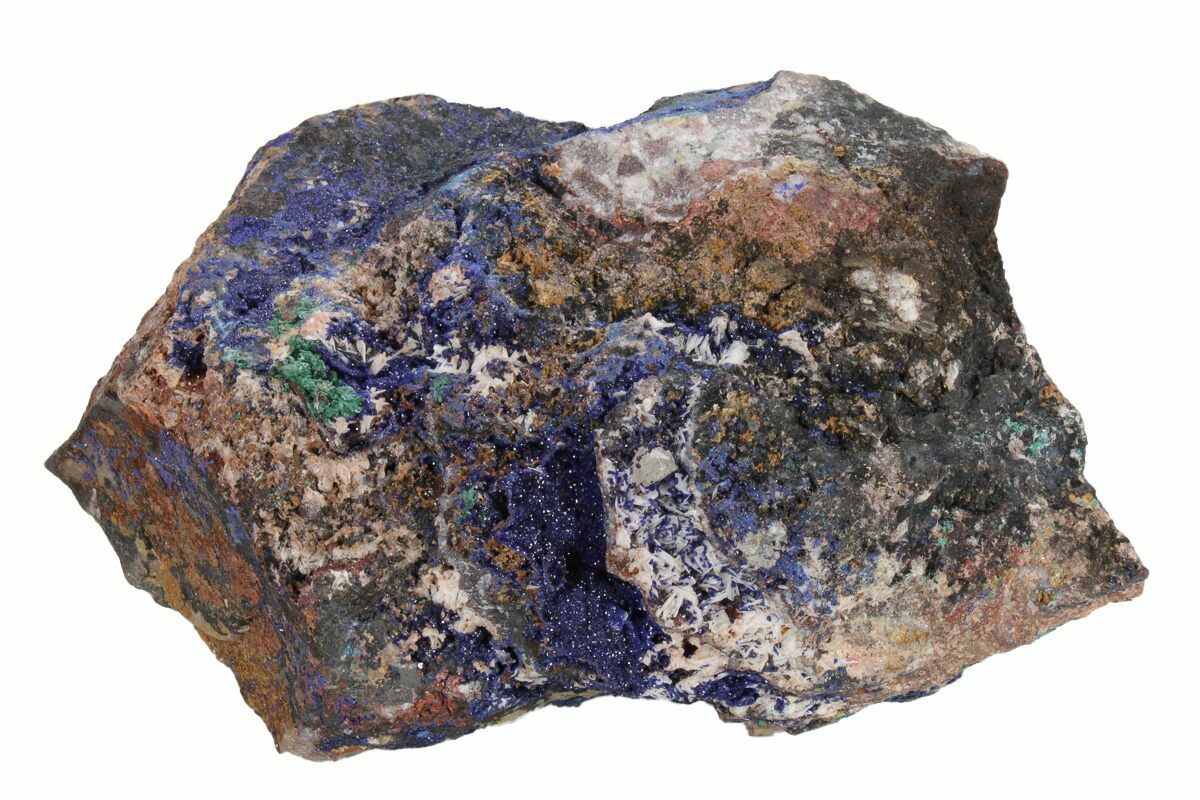 This 4.5" wide specimen features a druze of azurite that formed in association with malachite, collected from Morocco. The azurite and malachite formed over barite.