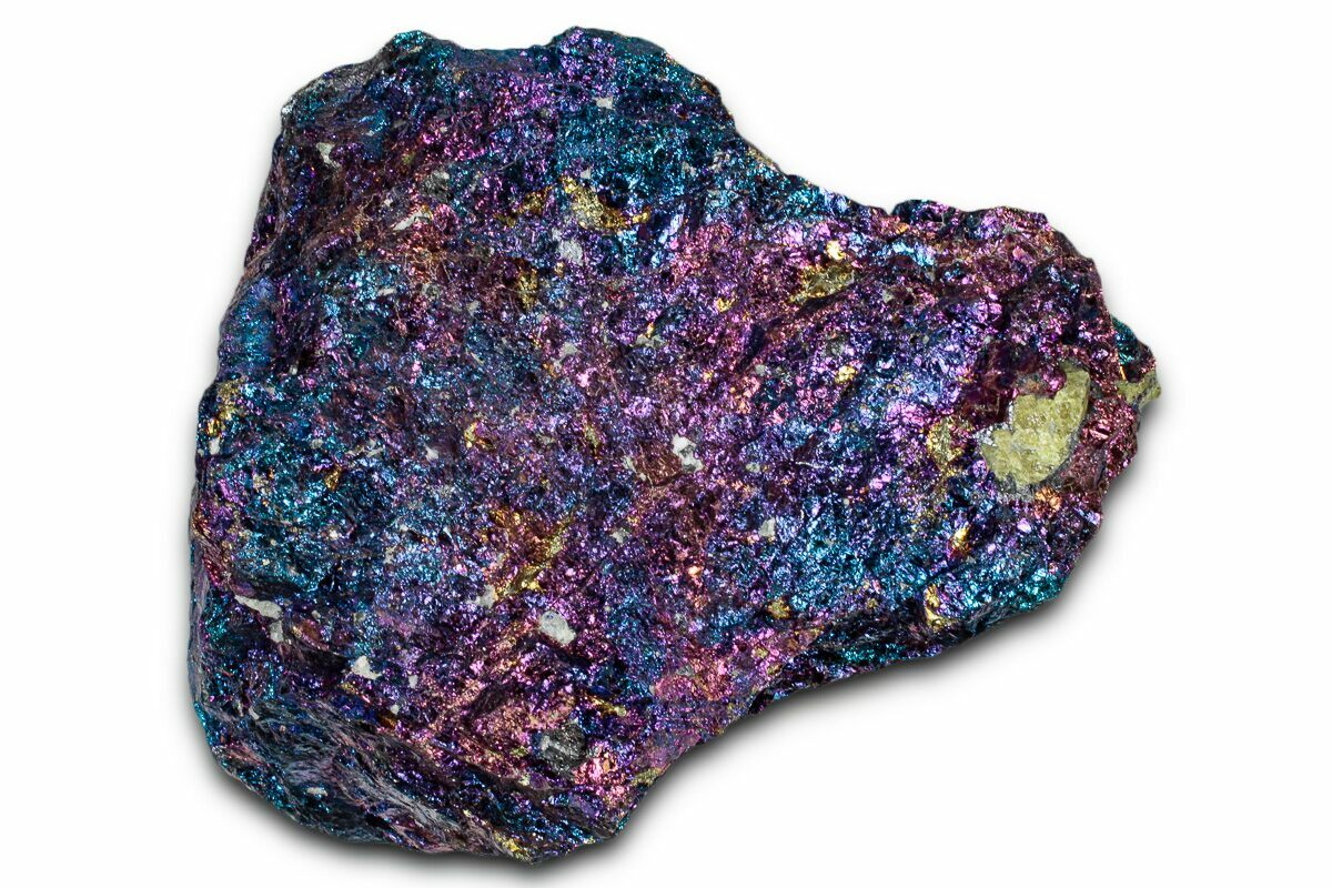 Often called “Peacock Ore” for its vivid, iridescent colors, this material is actually chalcopyrite that has been treated with acid. The treatment replicates a natural process that forms the much rarer copper mineral bornite.