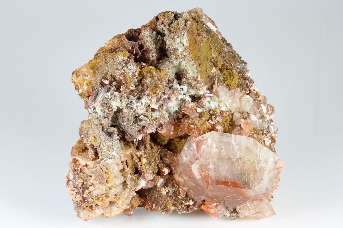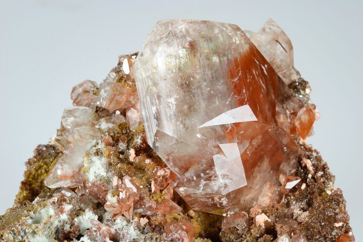 Calcite crystals are a form of calcium carbonate (CaCO₃) known for their diverse shapes, transparency, and vibrant range of colors. They typically form in rhombohedral, scalenohedral, or prismatic shapes, often with well-defined, sharp edges and glossy surfaces. Calcite crystals are often translucent or transparent, sometimes displaying a double refraction effect where objects viewed through the crystal appear doubled. They can appear in various colors—white, clear, yellow, pink, blue, green, and orange—depending on impurities or trace minerals.