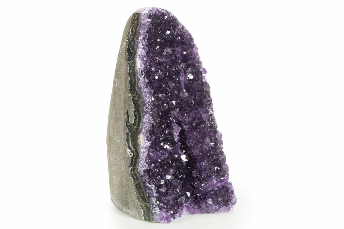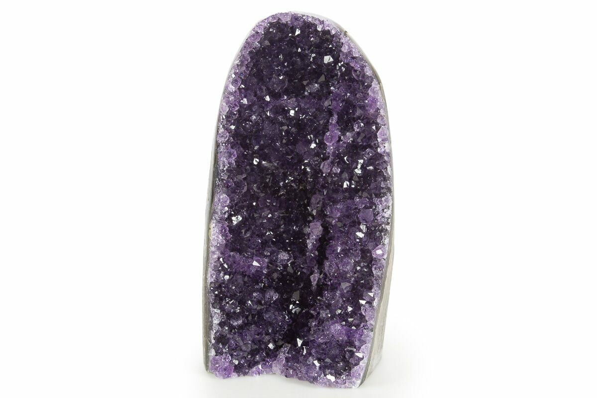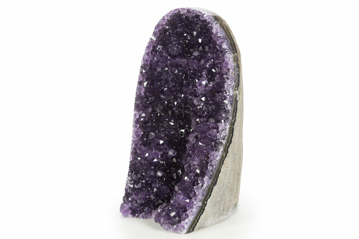 This is a 4.5" grape-jelly purple amethyst geode section from the famous amethyst mines in Artigas, Uruguay. The base has been cut flat so that it stands up nicely on a flat surface.