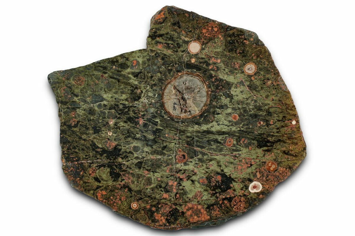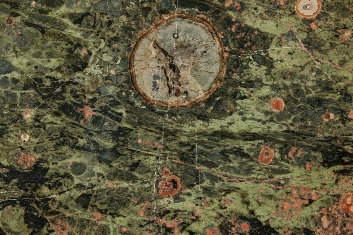 This is an exceptionally colorful 4.55" wide polished spherulitic rhyolite slab, collected from Turee Creek Station, near the town of Newman in Western Australia. One side has been cut flat and polished to a glossy finish. Spherulites are the small rounded orange/pink bodies within the mossy green rhyolite.