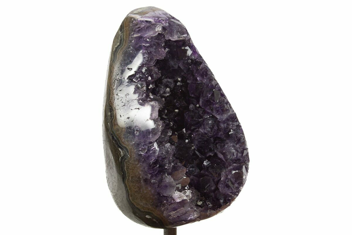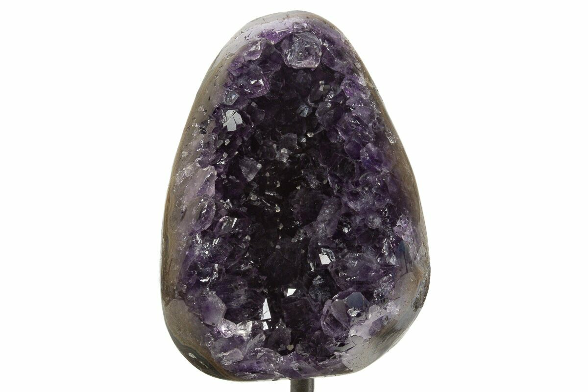 This is a gorgeous, dark amethyst crystal geode that has been mounted to a metal stand. The cluster itself is 4.6" tall by 3.3" wide. Including the stand, the specimen is 6.75" tall. The outer edge of the geode has been polished, allowing for display of the various crystal growth layers.