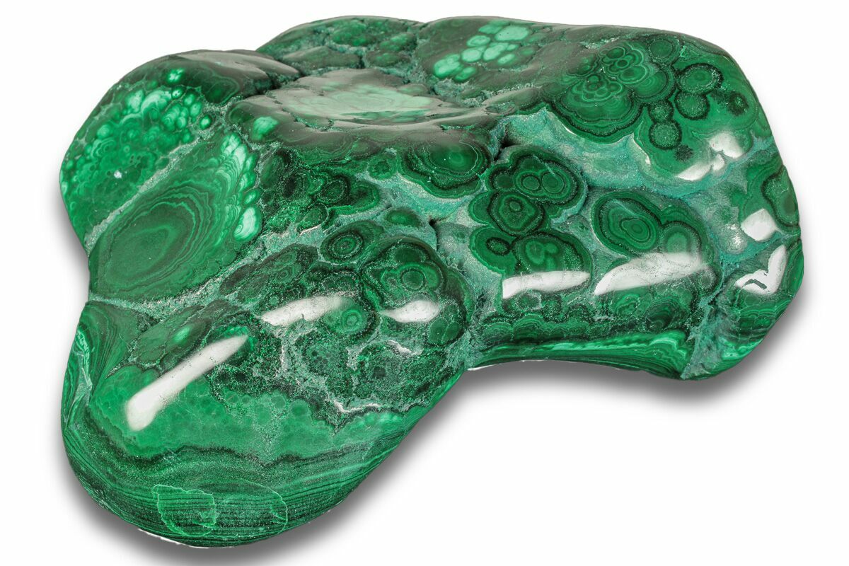 This is a 4.6" wide, hand-polished piece of vibrant green malachite. The lapidary work is quite nice and displays the natural botryoidal patterns of the mineral beautifully: the specimen has been polished to reveal its incredible flower-like banding patterns.