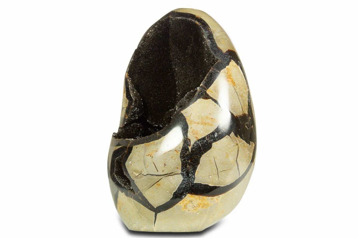 This is a 4.6" tall, polished septarian geode from the Betsiboka Region of Madagascar. Its hollow interior gleams with sparkling black-brown calcite crystals. Shaped from a natural septarian nodule, the piece showcases the formation’s signature cracked pattern, giving it a dramatic sculptural presence. The base has been cut flat so it stands securely for effortless display.