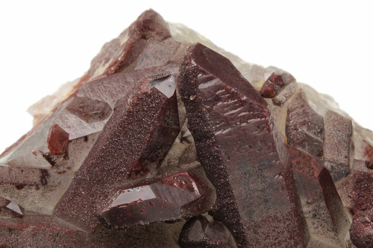 Morocco is one of the few sources of natural red quartz (also known ferruginous quartz) crystals. The red coloration of these quartz specimens is a result of iron oxidation (hematite) on and/or within the crystals. Some specimens can show banding-like patterns within their crystals when viewed in cross section, indicating that the iron content varied during formation. This can result in wonderful red quartz specimens that have clear quartz coatings and deep red phantoms within.