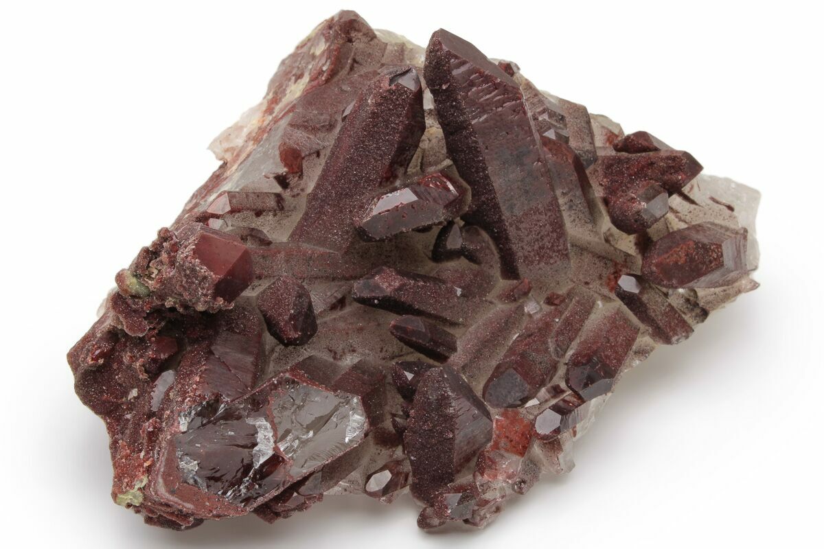 This is a top-quality cluster of natural red quartz crystals from Tinejdad, Morocco. The red coloration is due to iron oxidation across the exterior of the crystals, as well as inclusions through the crystals.