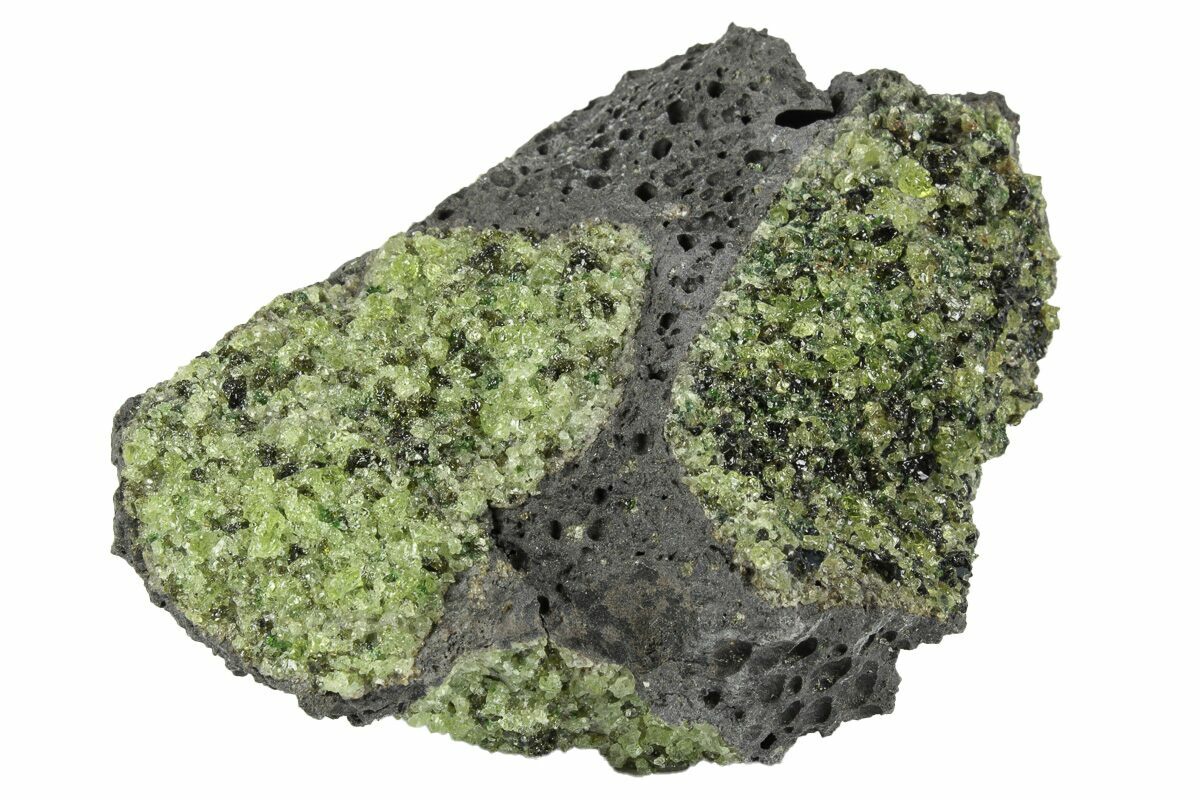This is a 4.6" wide specimen of peridot crystals in basalt, containing both light and dark green olivine peridot, collected from the San Carlos Apache Reservation in Arizona.