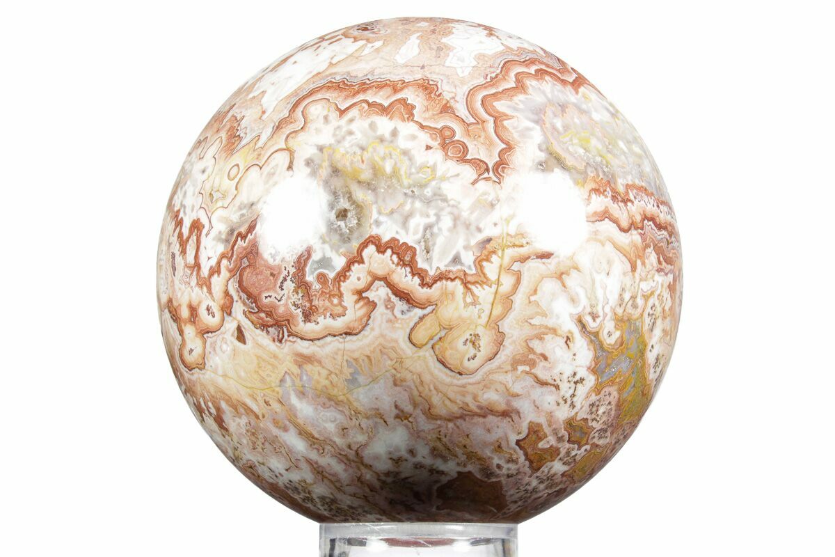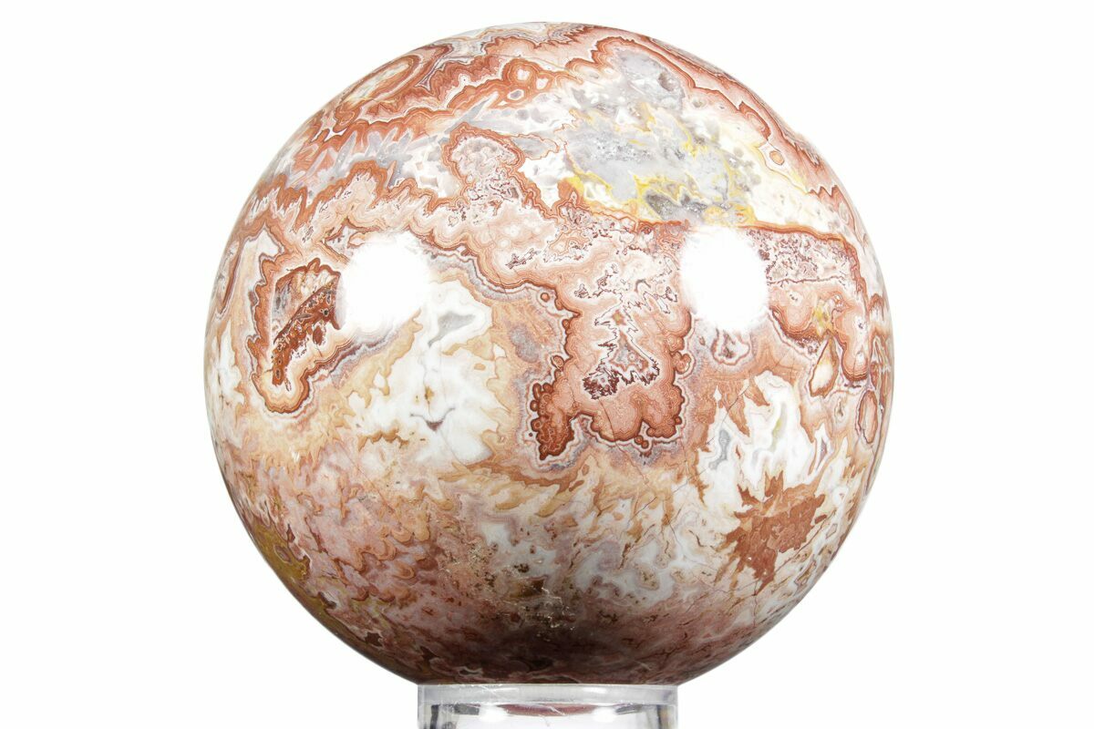 This is a beautiful, polished "crazy lace" agate specimen, also known as Mexican Agate, collected from Chihuahua, Mexico. This variety of agate is sometimes referred to as "fireworks lace", displaying chaotic, banded, and "exploding" patterns. It has been shaped into a sphere and polished to a glossy finish to highlight the incredibly detailed banding of the agate. The polish on this specimen is flawless.