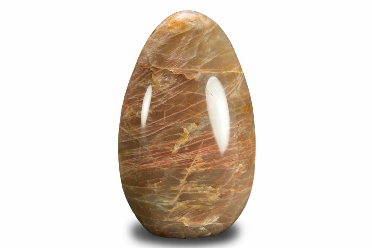 This is a piece of polished black-peach moonstone, mined and crafted in Madagascar. The base of the specimen has been cut flat for upright presentation. Moonstone gets its name from a visual effect caused by light diffraction within the micro-crystalline structure called chatoyance. Moonstone is composed of two feldspar varieties, orthoclase and albite. The two species intermingle with heat and as the newly formed mineral cools, orthoclase and albite intergrowths separate into stacked, alternating layers.