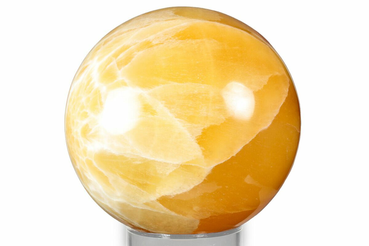 This is a sphere carved from bright yellow-orange honeycomb calcite from Utah that has been hand-polished to a lustrous finish. This unique specimen has multiple layers and striations that vary between white, yellow, and orange hues.