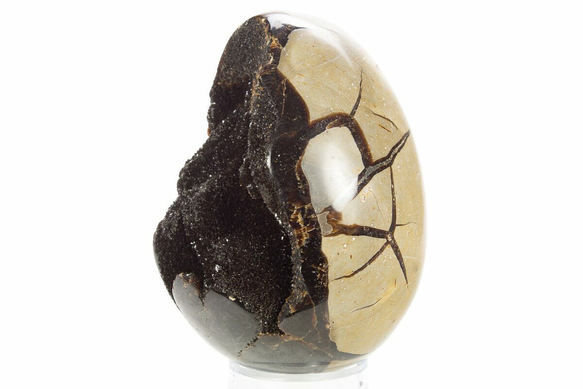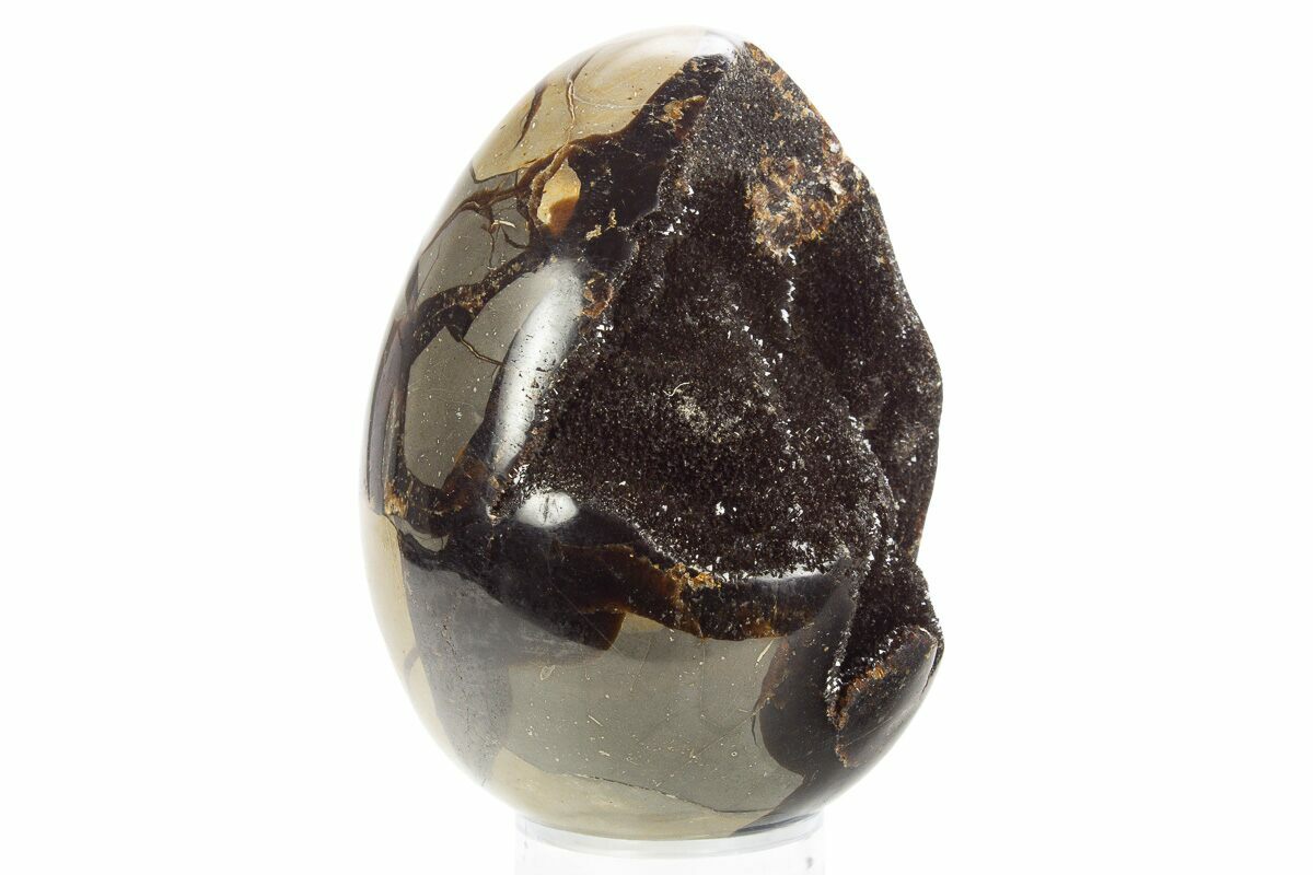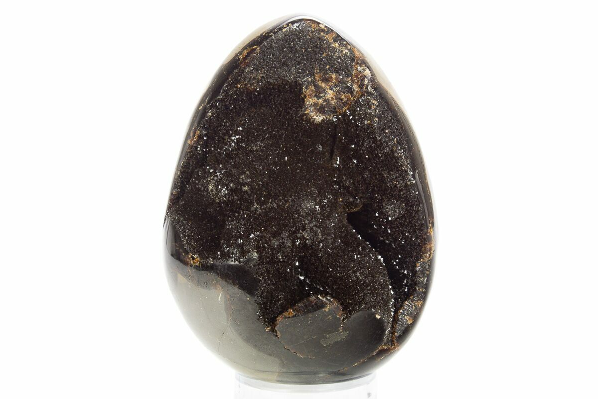 This is a gorgeous septarian "dragon egg" geode collected in the Betsiboka Region of Madagascar. The hollow cavity is full of beautiful, sparkling black & brown calcite crystals. It is a hollow septarian nodule which has been polished into an egg shape, and the natural cracked pattern of the septarian gives it the appearance of a dragons egg. A spectacular display piece which would look great in your home/office or make a great gift for the Game of Thrones enthusiast you know.