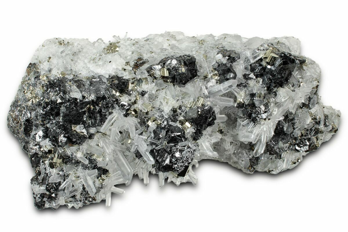 This is a gorgeous specimen! It contains small clusters of gleaming pyrite and lustrous sphalerite crystals on a bed of sharp quartz crystals that vary significantly in size. It was collected from the Huanzala Mine in Peru and measures 4.6" wide. The specimen exhibits an alluring sparkle when rotating back and forth beneath a light source.