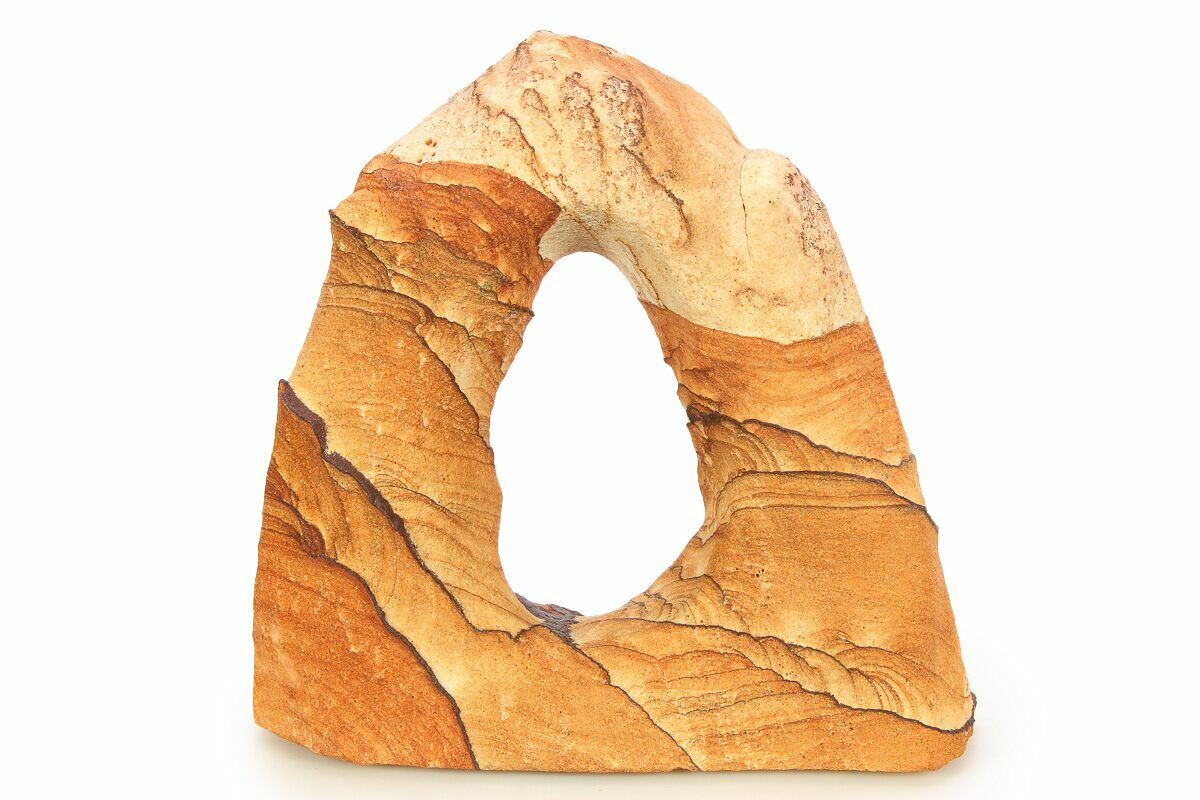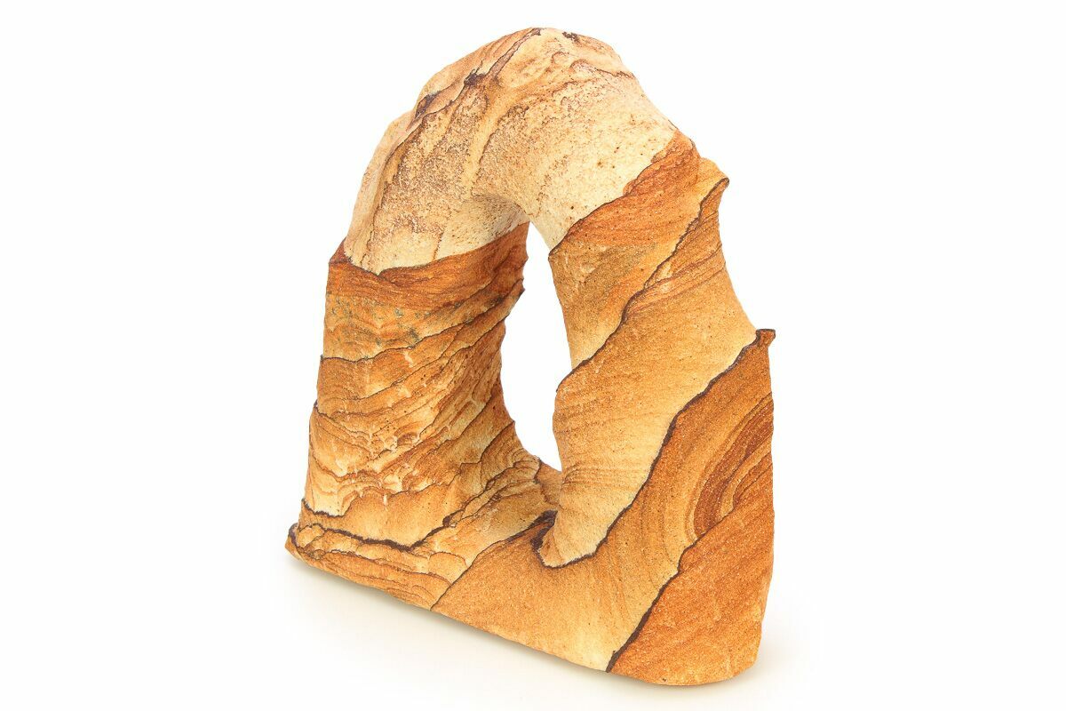 This is a 4.6 tall Toroweap picture sandstone arch. This stunning and distinctive sandstone, mined near Snowflake, Arizona, has been artistically crafted into an arch shape, inspired by natural sandstone formations like Delicate Arch in Arches National Park. The base of this specimen has been cut flat for vertical presentation.