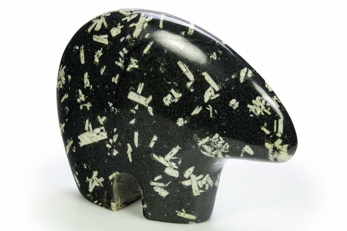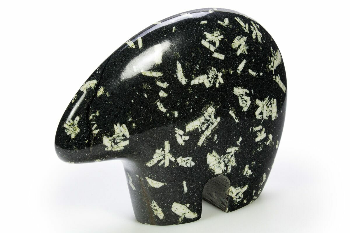 This is a beautiful piece of Chinese writing rock from Whim Creek, Western Australia that has been polished into an abstract bear shape. This specimen measures 4.65 inches long and its glossy polish allows the intricate feldspar crystal formations to really stand out. The base has been cut flat so it stands up nicely on a hard surface.