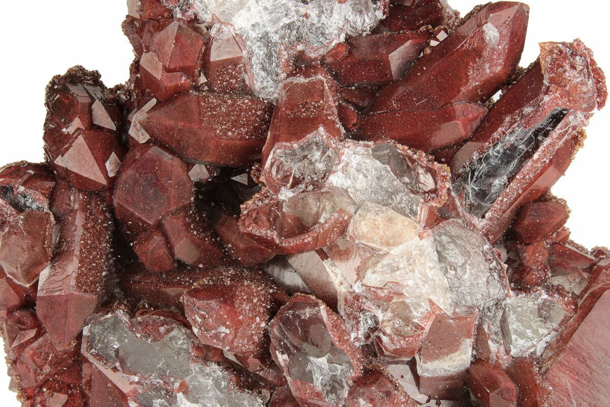 This is a top-quality cluster of natural red quartz crystals from Tinejdad, Morocco. The red coloration is due to iron oxidation across the exterior of the crystals, as well as inclusions through the crystals.