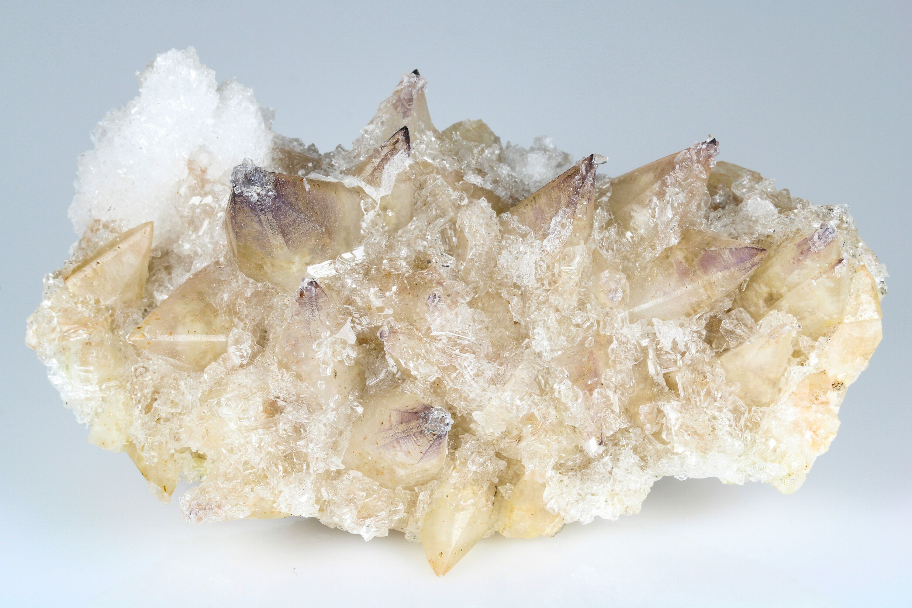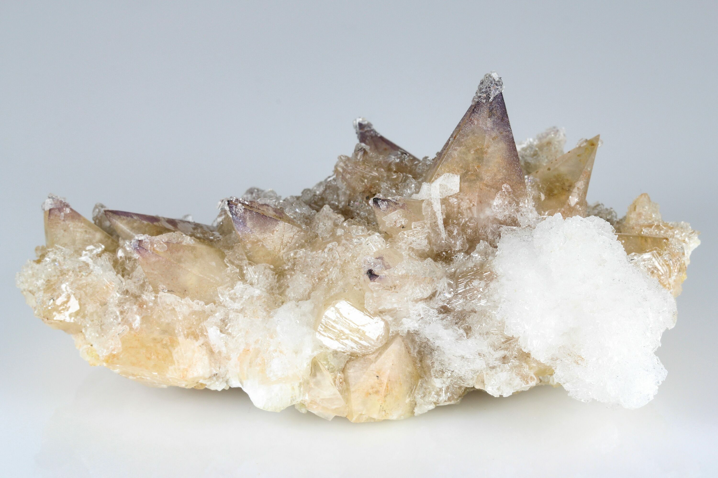This is an intriguing, 4.7" wide, calcite crystal cluster that is part of a new find in Qinglong, China. The scalenohedral calcite crystals are encrusted in gypsum crystals and microscopic purple fluorite crystals. It is claimed that this fluorite is Yttrofluorite (fluorite containing an appreciable amount of the rare earth element yttrium), but we have not been able to independently verify this.