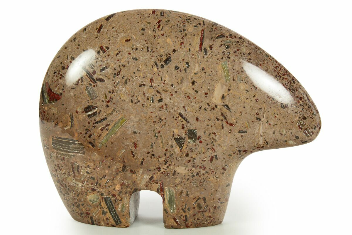 This is a 4.7" long hand-carved Zuni bear fashioned from beautifully patterned Brecciated Chert mined in the Pinyalling Hills of Western Australia. The stone’s natural mosaic of angular fragments and earthy colors gives the carving exceptional visual appeal, and it stands attractively on a flat surface for easy display.