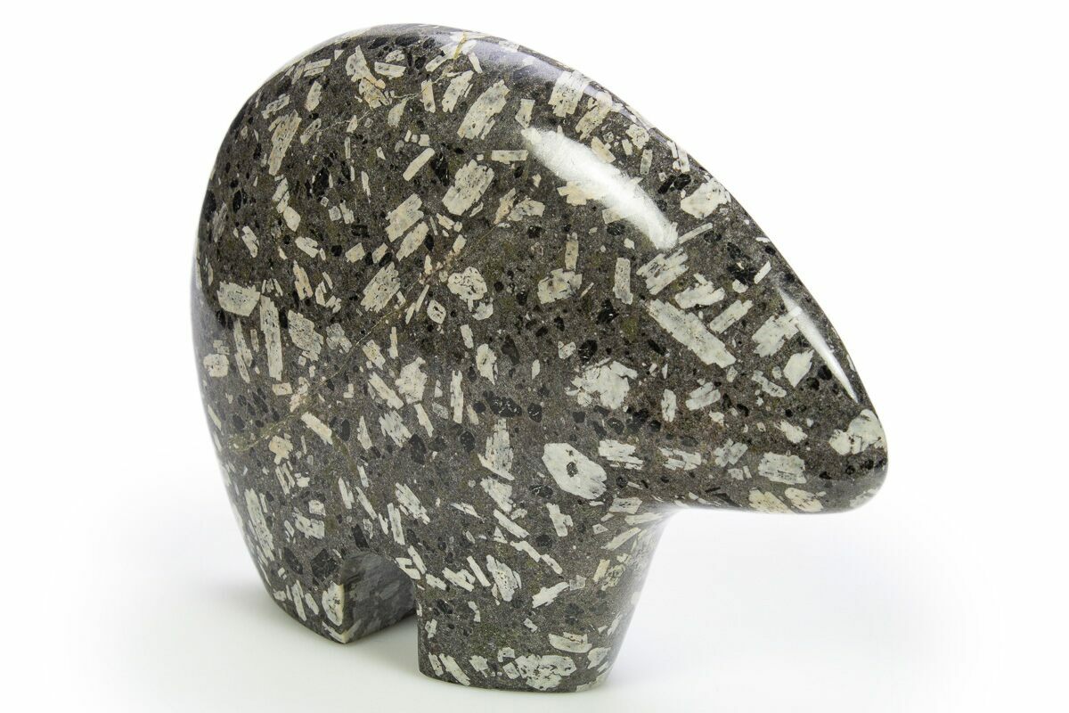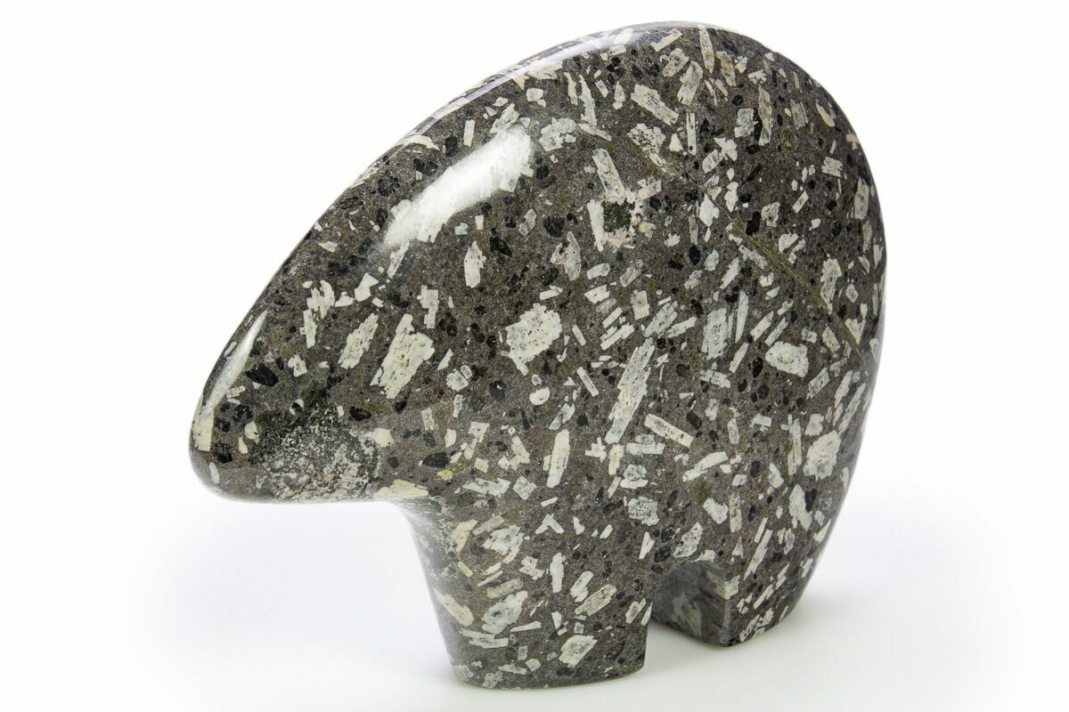 This is a beautiful piece of Chinese writing rock from Utah that has been polished into an abstract bear shape. This specimen measures 4.7 inches long and its glossy polish allows the intricate feldspar crystal formations to really stand out. The base has been cut flat so it stands up nicely on a hard surface.