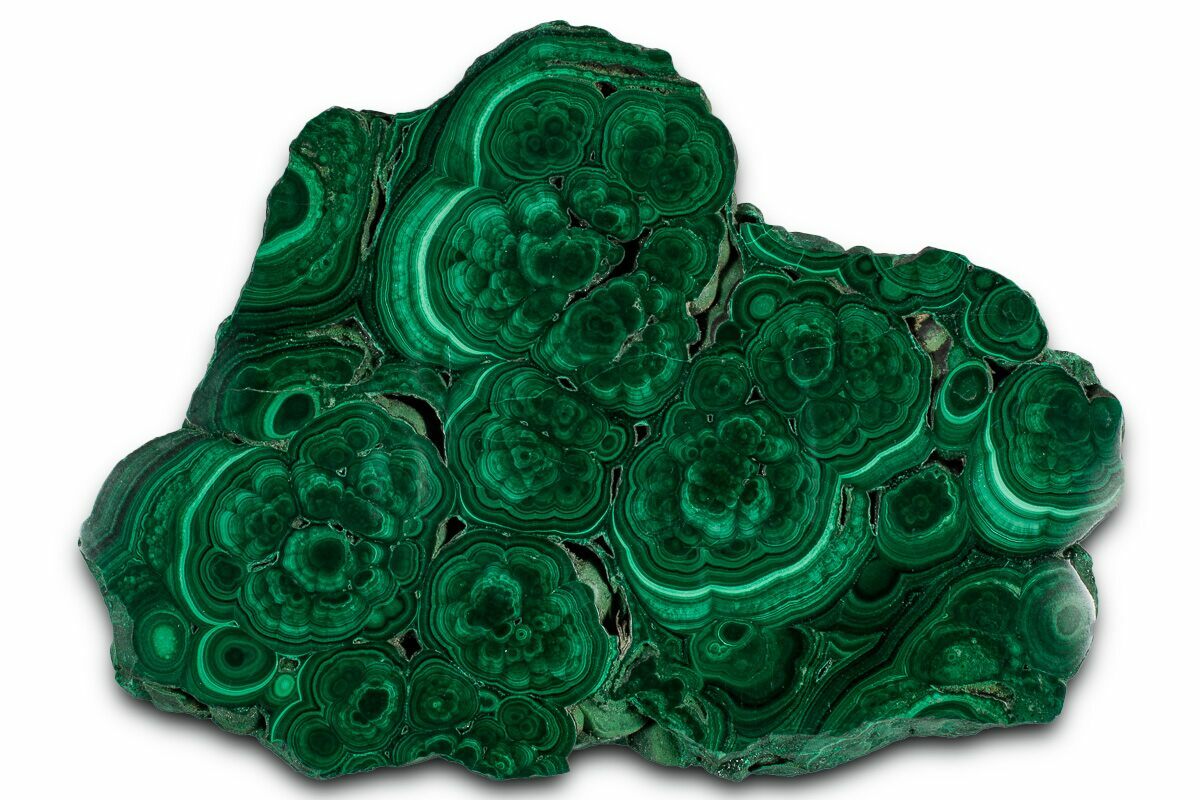 Malachite is an intense green copper-based mineral that can be found in a wide variety of forms. Malachite can grow in botryoidal masses, stalactitic formations, and reniform formations, typically as a tight cluster of fanning fibrous needles that make up a seemingly solid mass. As layers continue to stack during formation, banded patterns can sometimes begin to take shape, explaining the rings in all shades of green seen on most polished malachite specimens.