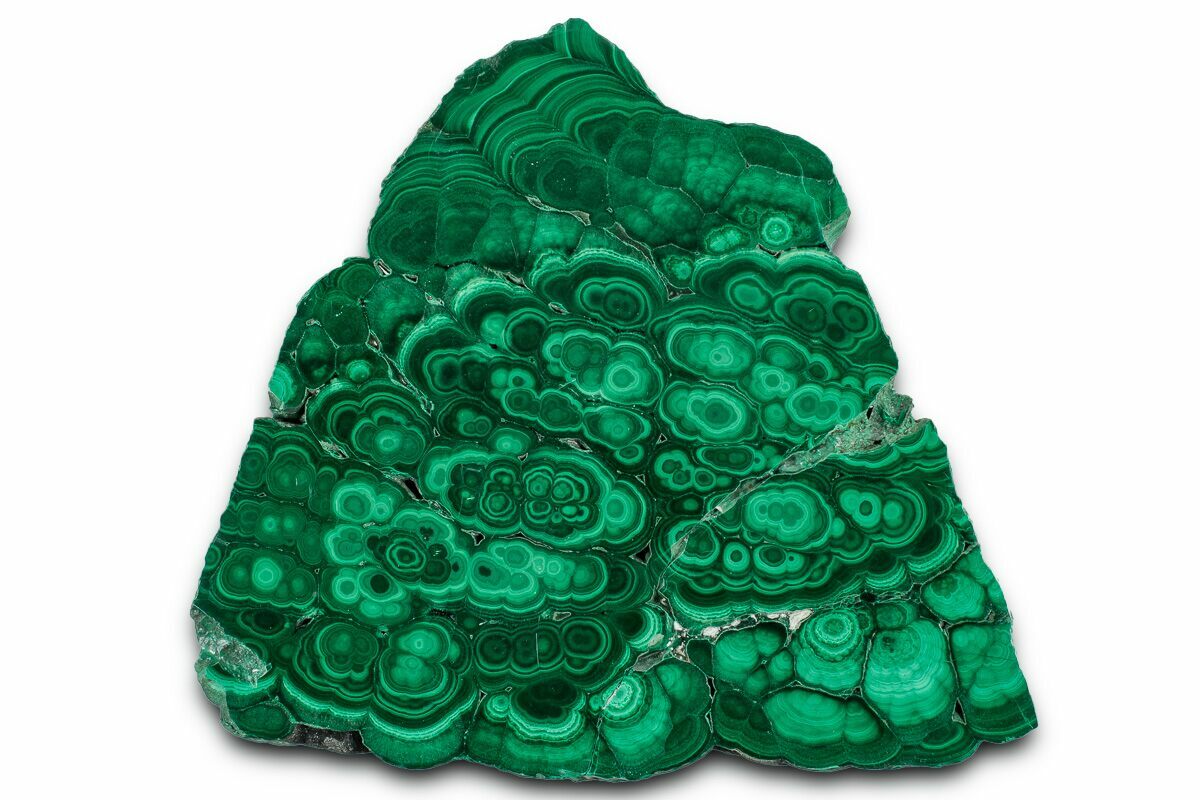 Malachite is an intense green copper-based mineral that can be found in a wide variety of forms. Malachite can grow in botryoidal masses, stalactitic formations, and reniform formations, typically as a tight cluster of fanning fibrous needles that make up a seemingly solid mass. As layers continue to stack during formation, banded patterns can sometimes begin to take shape, explaining the rings in all shades of green seen on most polished malachite specimens.