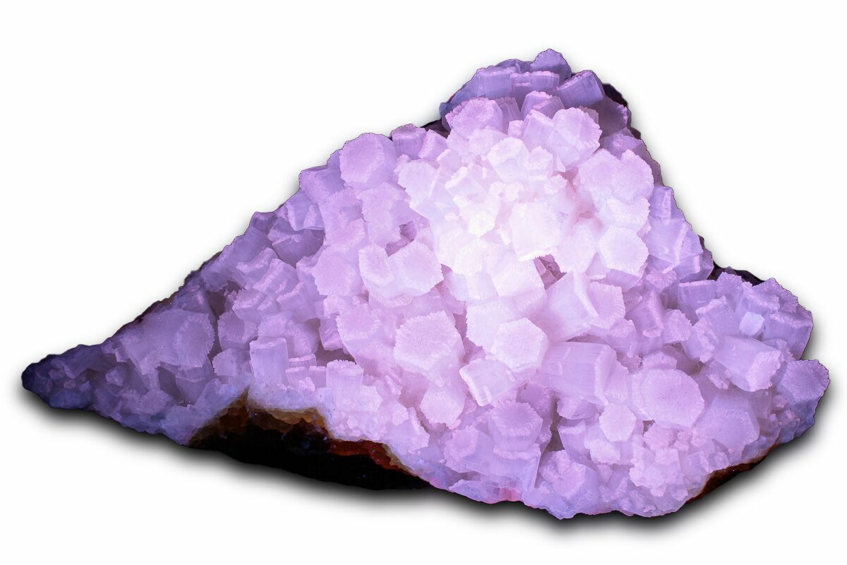 This is a 4.7" wide aragonite and sulfur crystal association, collected from the Giumentaro Mine in Sicilia, Italy. What could be considered the top of the specimen, contains elongated, hexagonal aragonite crystals that display a vibrant wihte-pink fluorescence when placed under shortwave UV lighting. Small sulfur crystal remnants can be found between these aragonite crystals. What could be considered the bottom of the specimen contains stronzianite druze.