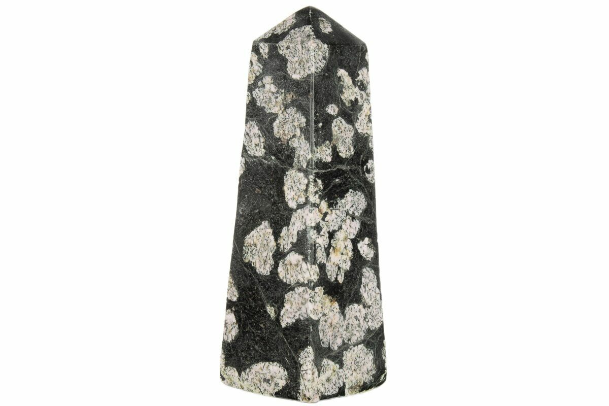 This is a 4.7" tall polished obelisk (tower) made from a mineral deposit in Pakistan. This specific material can be found on the market labelled as "snowflake obsidian", "snowflake rhodonite", "rhodonite (snowflake)", "dendritic rhodonite", etc.. While this stone is definitely not made from obsidian, rhodonite is a good possibility. However due to this uncertainty, we are just referring to these specimens as snowflake stone.