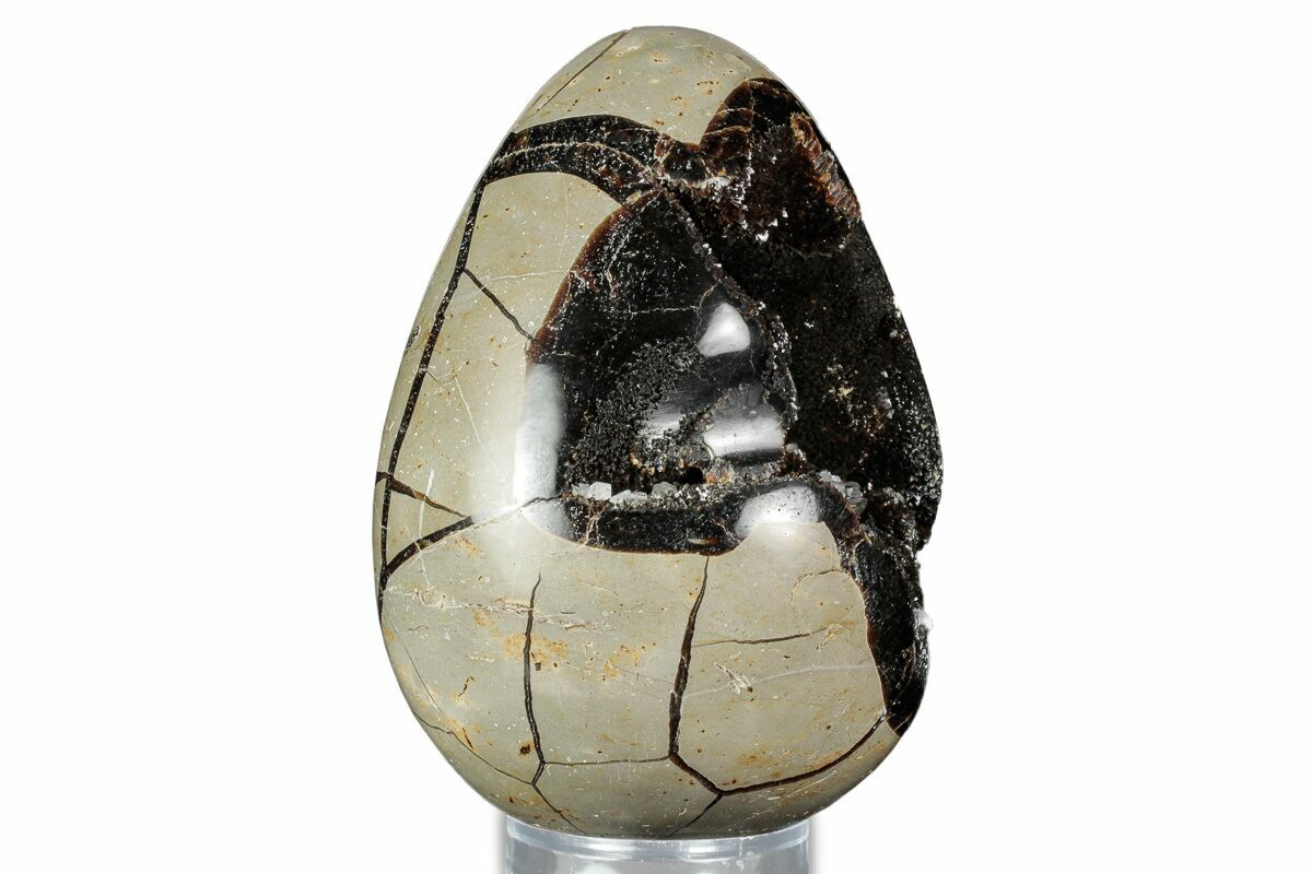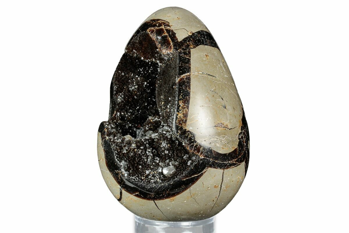 This is a gorgeous septarian "dragon egg" geode collected in the Betsiboka Region of Madagascar. The hollow cavity is full of beautiful, sparkling black & brown calcite crystals. It is a hollow septarian nodule which has been polished into an egg shape, and the natural cracked pattern of the septarian gives it the appearance of a dragons egg. A spectacular display piece which would look great in your home/office or make a great gift for the Game of Thrones enthusiast you know.