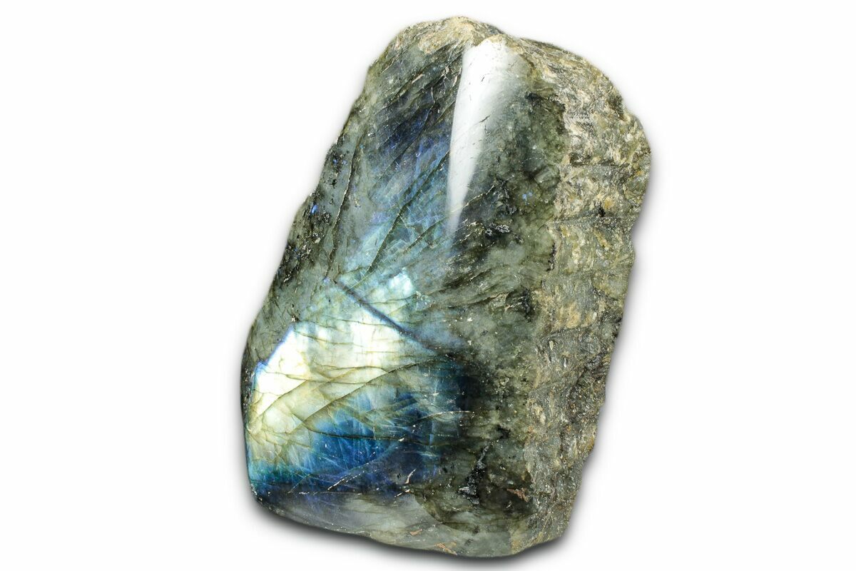 This is a brilliant 4.7" tall section of labradorite collected near Ampanihy, Madagascar. One face has been expertly polished to reveal the stone’s remarkable color play, while the base has been cut flat so it stands nicely on a hard surface. Vivid flashes of blue, green, and yellow shift and brighten as you rotate the piece, showcasing the dynamic labradorescence Madagascar is known for.