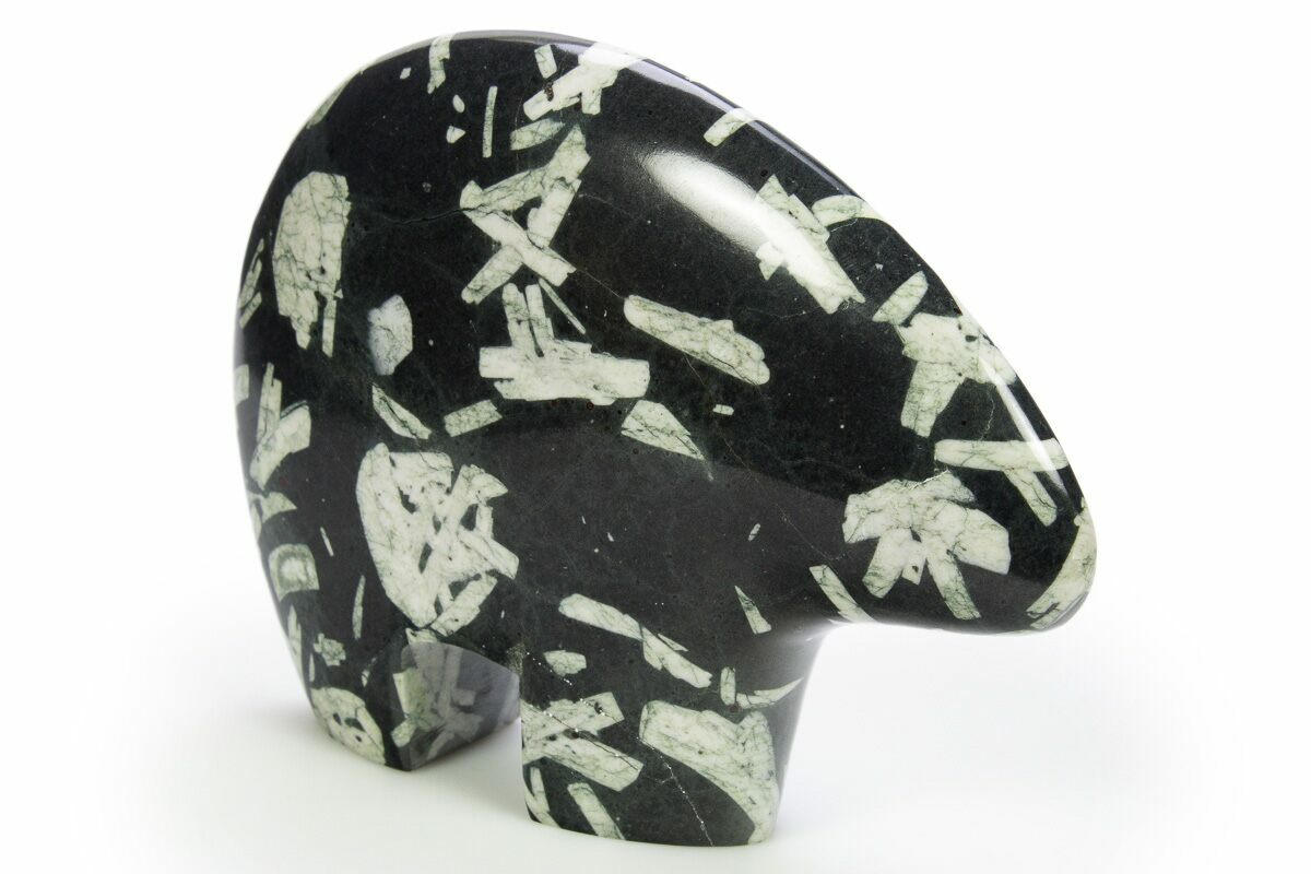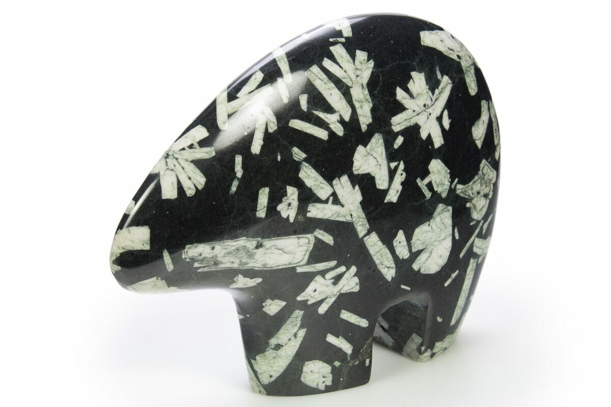 This is a beautiful piece of Chinese writing rock from Auburn, California that has been polished into an abstract bear shape. This specimen measures 4.75 inches long and its glossy polish allows the intricate feldspar crystal formations to really stand out. The base has been cut flat so it stands up nicely on a hard surface.