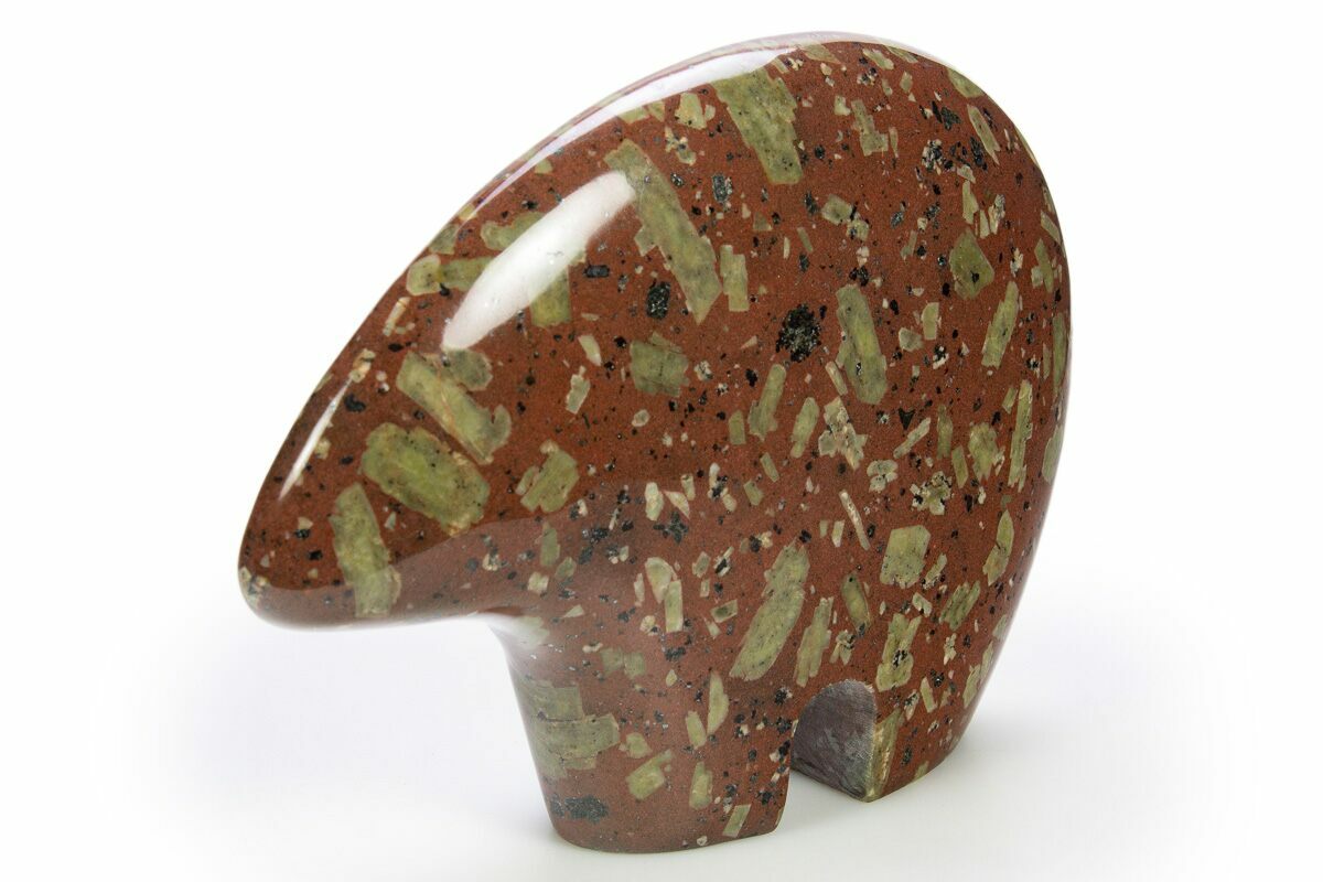 This is a beautiful polished bear sculpture carved from a piece of Chinese writing rock collected in South Africa. This colorful guy measures 4.75 inches long and has been polished to a glossy finish.