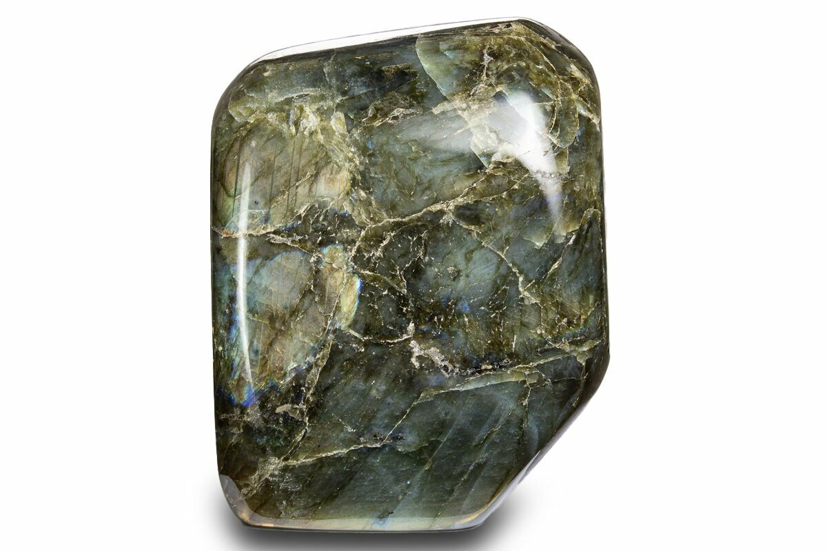 This is a gorgeous, flashy, labradorescent piece of labradorite polished into a beautiful free form statue. The brilliant blues, greens, golds, and oranges in the rock have a lot of play in the light, giving the piece an entirely different personality when viewed in different angles and lighting. Portions of this specimen are composed of naturally associated rock that doesn't display the typical labradorescent effects.