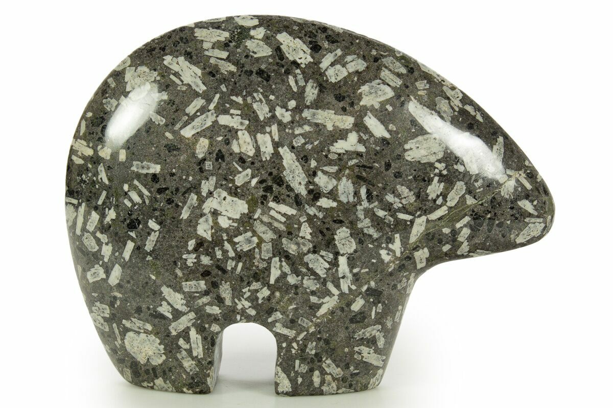 This is a 4.7" long hand-carved zuni bear sculpted from Chinese Writing Rock, a distinctive stone prized for its dark matrix crisscrossed with light-colored feldspar patterns that resemble ancient script. The carving stands upright on a hard surface and makes an eye-catching display piece, beautifully highlighting both the craftsmanship and the stone’s natural, calligraphy-like markings.